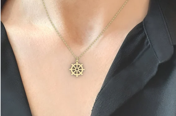 The Dharma Wheel (Dharmachakra) represents the teachings of Buddha and the path to enlightenment. Dharma Wheel jewelry is worn for spiritual guidance.