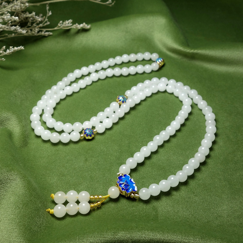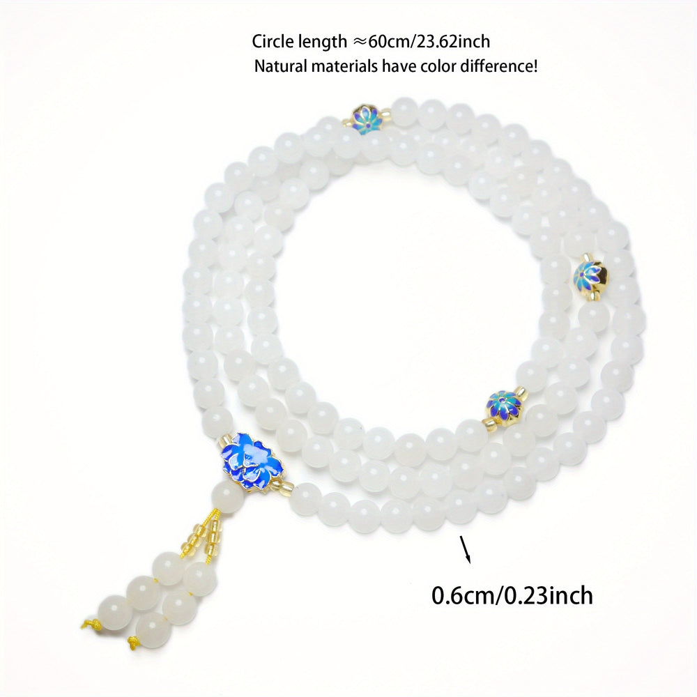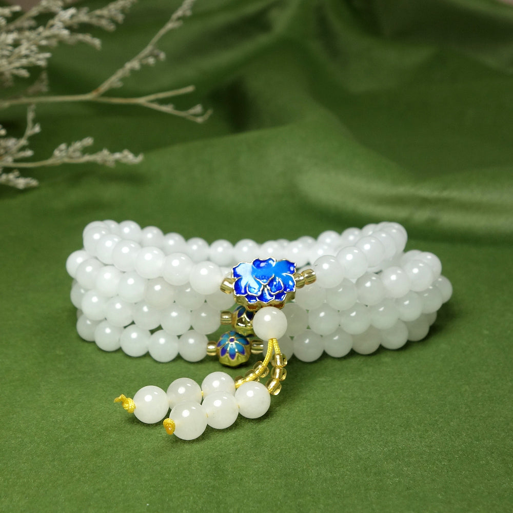 The white stone beads represent purity and clarity, ideal for mindful living accessories. The blue enamel patterns create a vibrant contrast that enhances the bracelet's visual appeal and energetic properties.