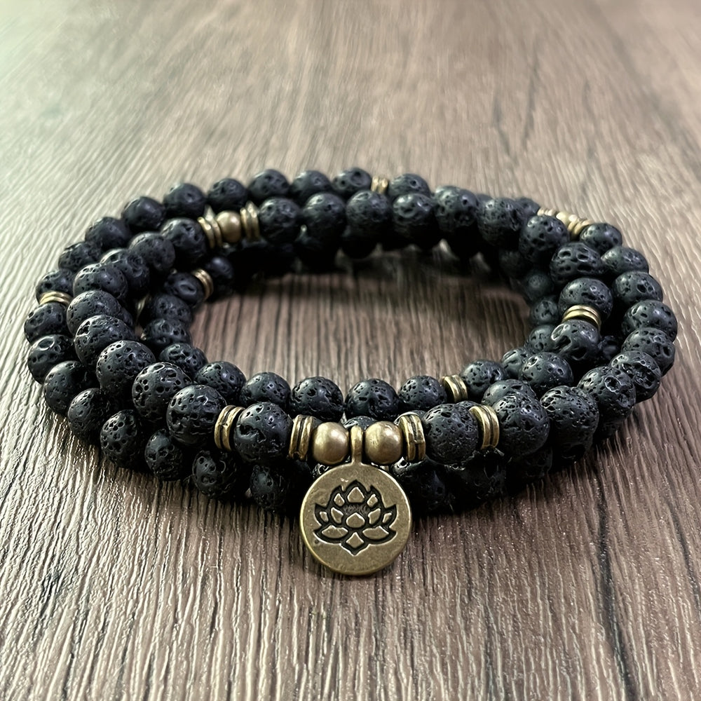 This 108 beads mala bracelet combines natural black stone beads with a vintage-style lotus pendant. The sacred number 108 represents spiritual completeness while the lotus symbolizes purity and enlightenment. Perfect for daily wear as a spiritual energy tool and protective talisman.
