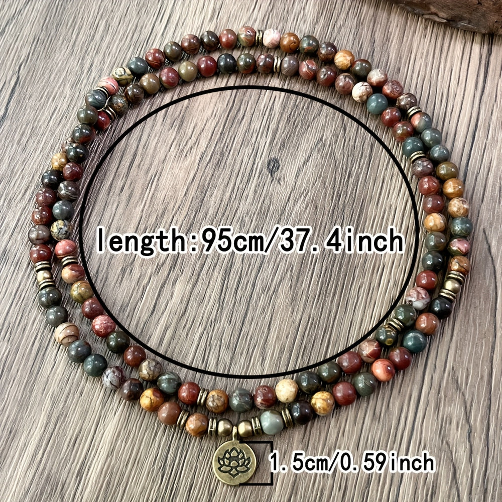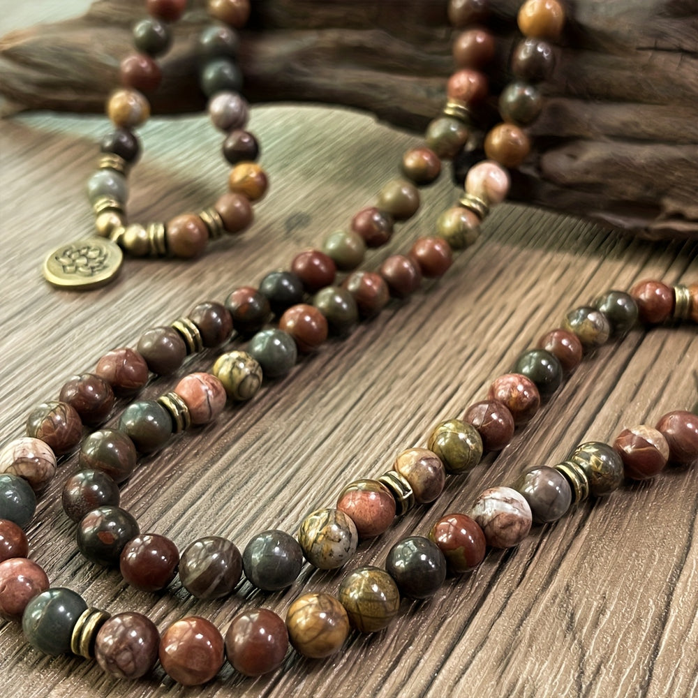 Our 108 Mala Beads Picasso Jasper Bracelet combines bohemian chakra jewelry elements with natural stone energy for powerful meditation and spiritual connection. Each bead is carefully selected for its unique color properties and energetic resonance.