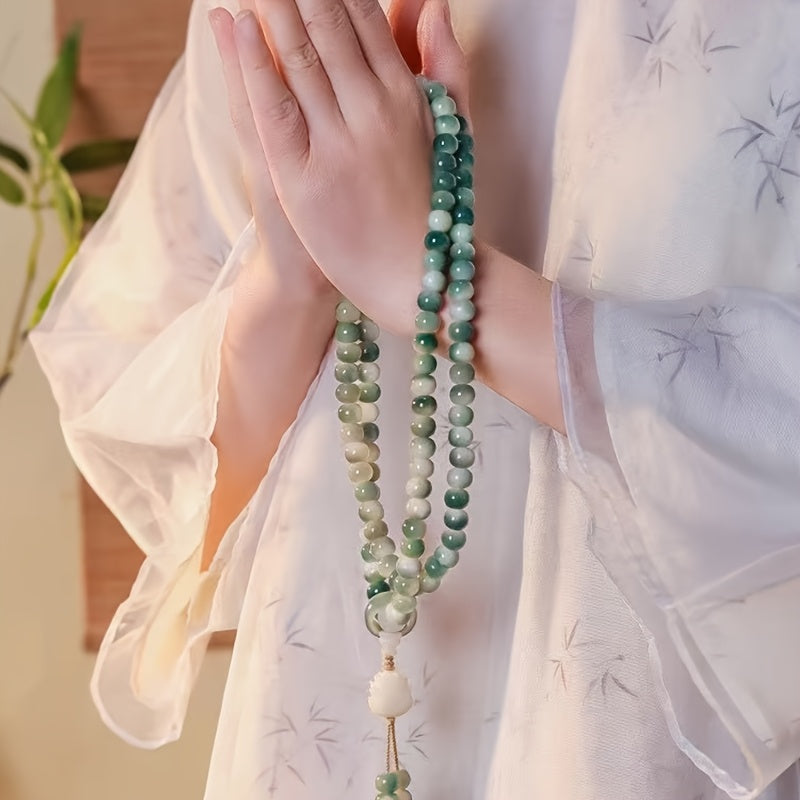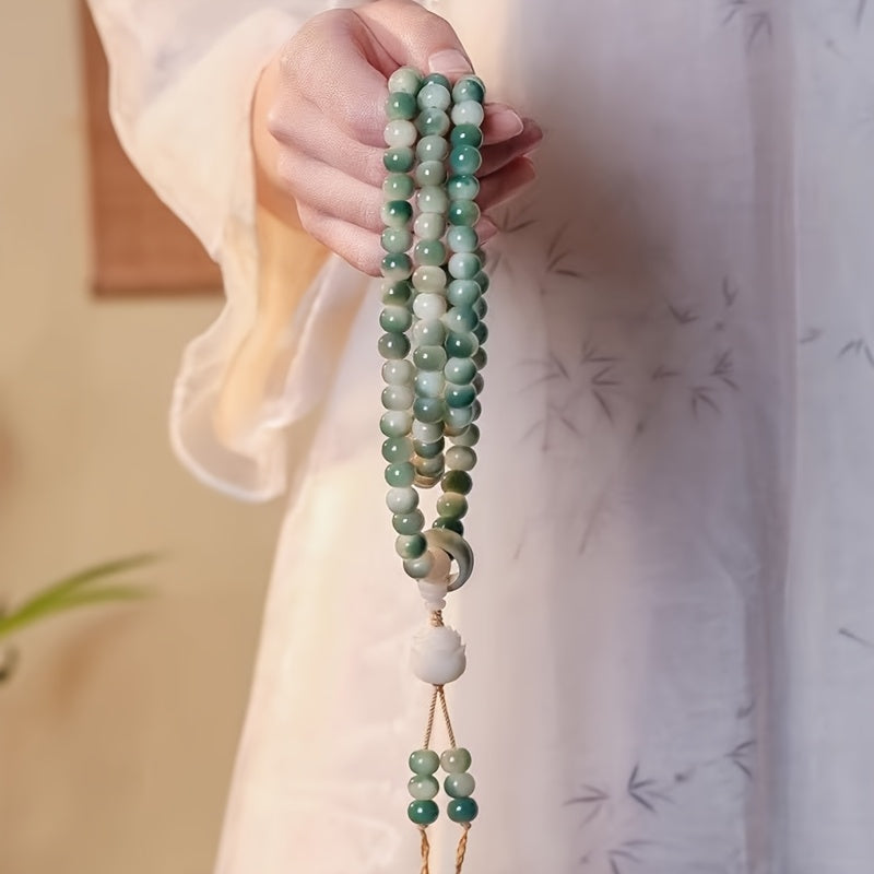 This natural bodhi bead bracelet features 108pcs of 10x10mm vintage green prayer beads with white accents. Perfect for meditation, spiritual growth, and casual attire, this handheld mala beads set combines natural materials with elegant design.