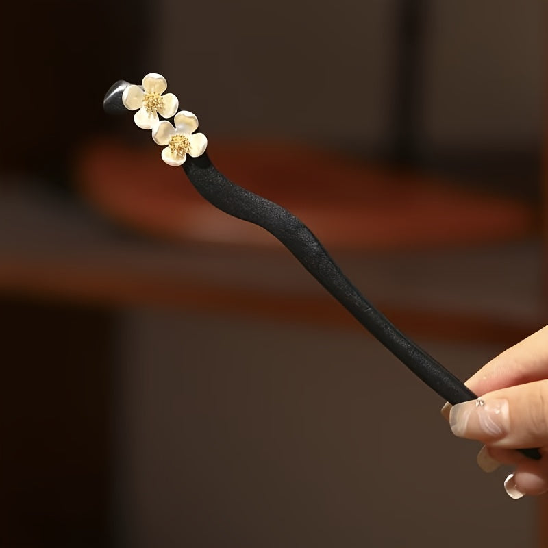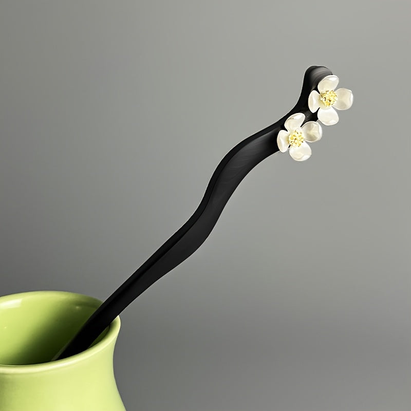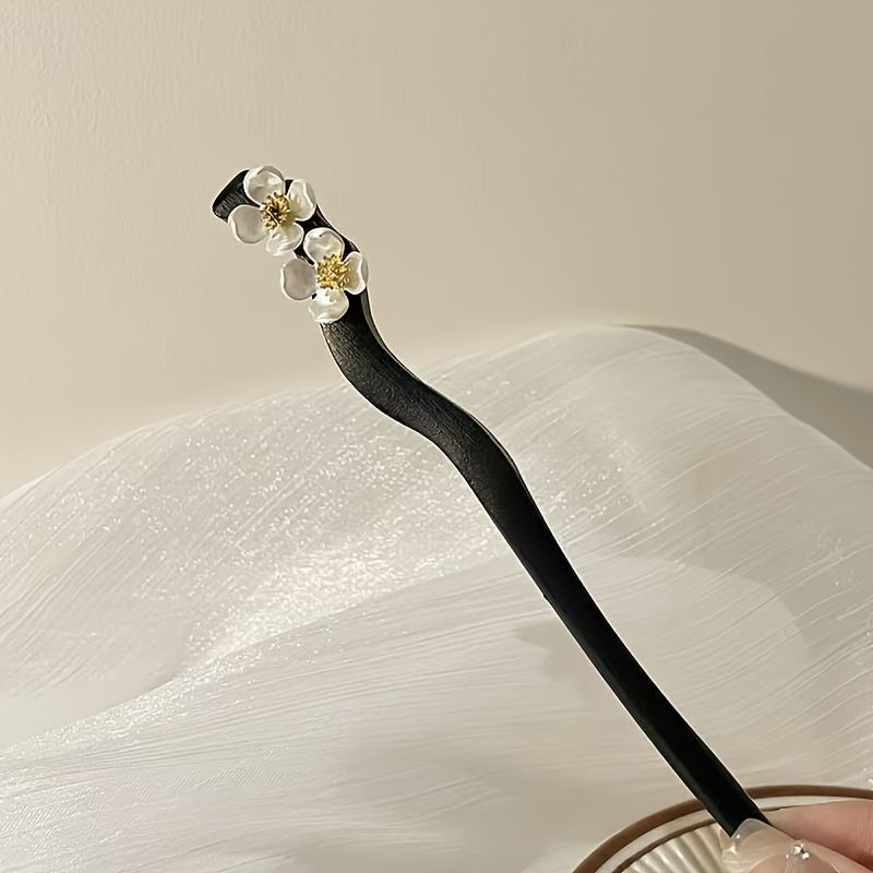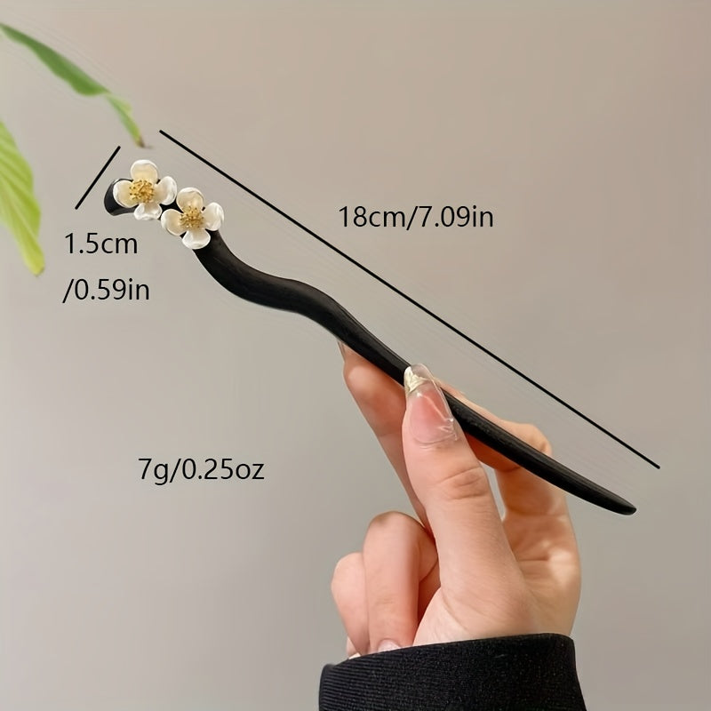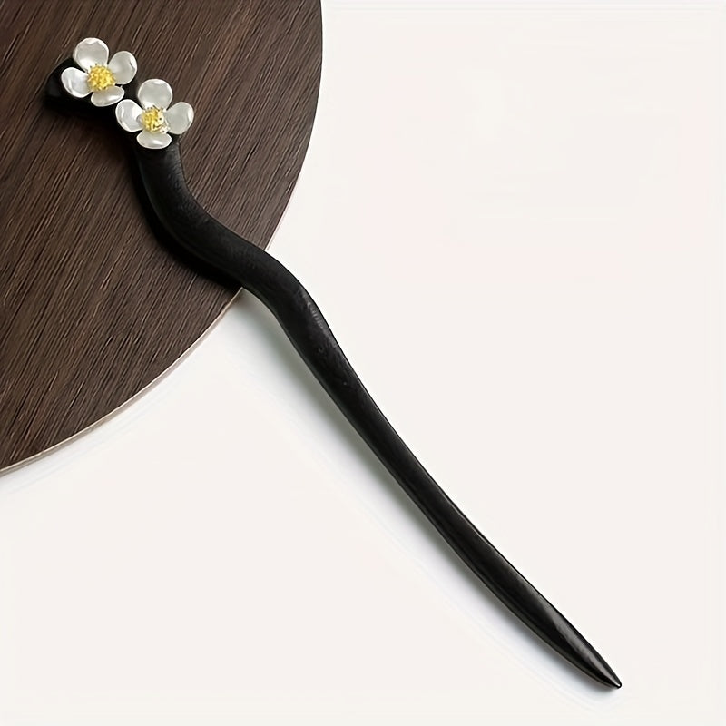 This elegant Chinese hairpin features a minimalist floral design with black wood and white flower accents. The combination of durable black wood and delicate white flowers creates an elegant accessory perfect for traditional hairstyles, modern hairstyles, and formal events.