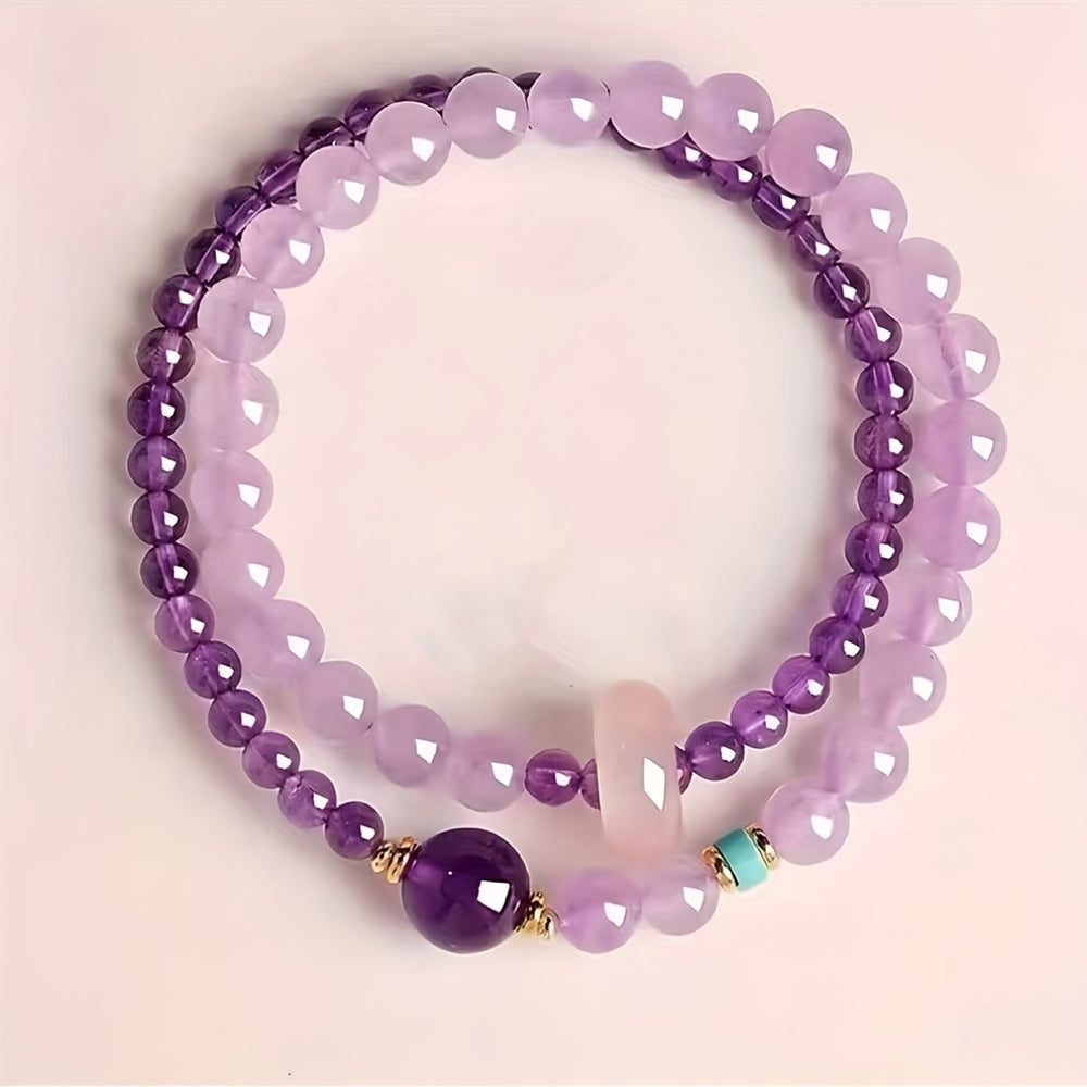 This elegant purple bracelet features double circle design with lavender beads and lucky charms. The combination of purple's creative energy and pink's harmony symbolism creates an elegant accessory perfect for daily wear or special occasions.