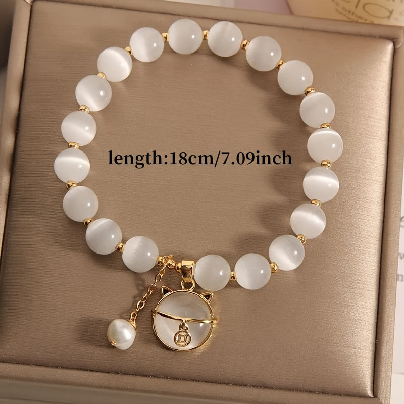 The bracelet is crafted with synthetic white opal beads (cat’s eye effect), known for their soothing glow. Accented with gold-tone alloy spacers and a delicate cat charm, it also features a small pearl-like bead for added elegance. Durable elastic string ensures comfortable daily wear.