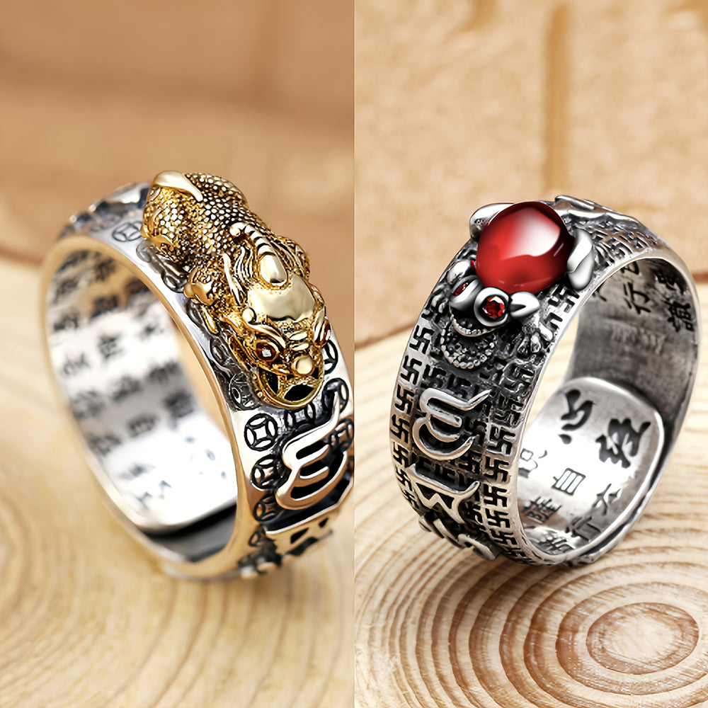 The Pixiu symbol is revered in Chinese culture for attracting wealth and warding off negative energy, while the dragon motifs represent authority, prosperity, and good fortune. The red gemstones enhance luck and vitality, making these rings ideal for daily wear or special occasions.
