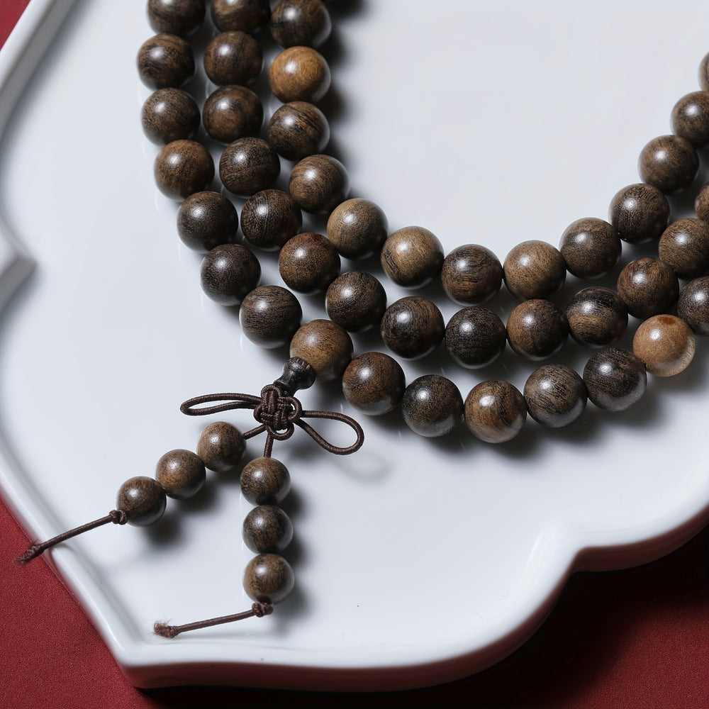 This 8mm Indonesian Agarwood Bead Bracelet features natural wood grain texture with deep brown hues symbolizing stability and nature. The 108 beads represent spiritual purification in Buddhist tradition, perfect for meditation or daily wear.