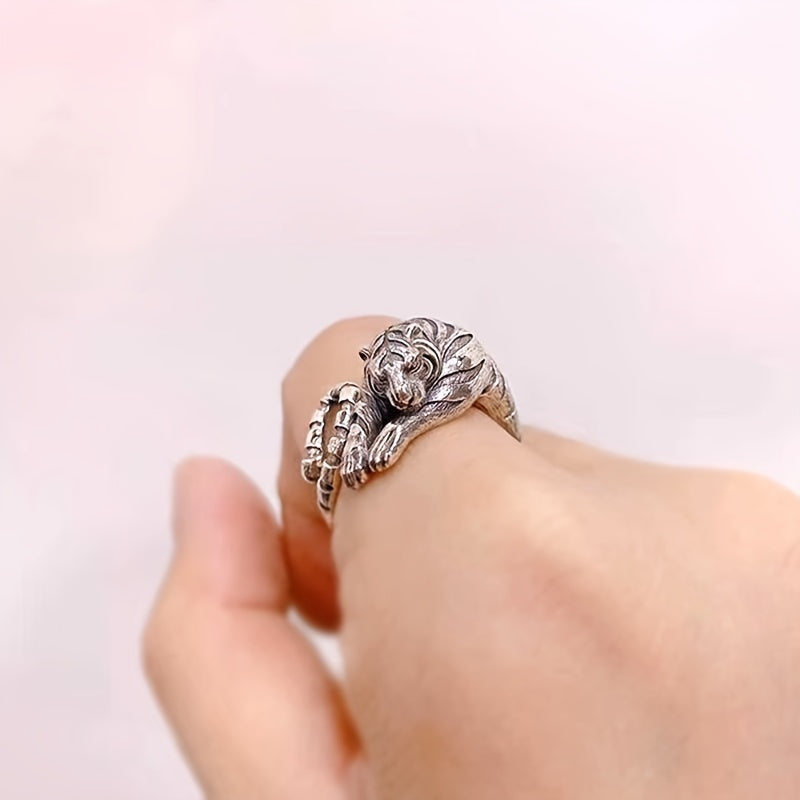 This 925 silver tiger ring features the Chinese zodiac tiger symbol in a new vintage design. The silver-gray base with red accents creates an elegant look perfect for daily wear or special occasions.
