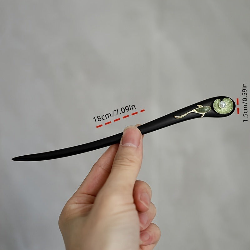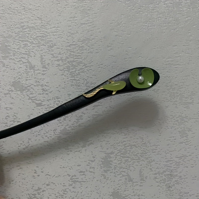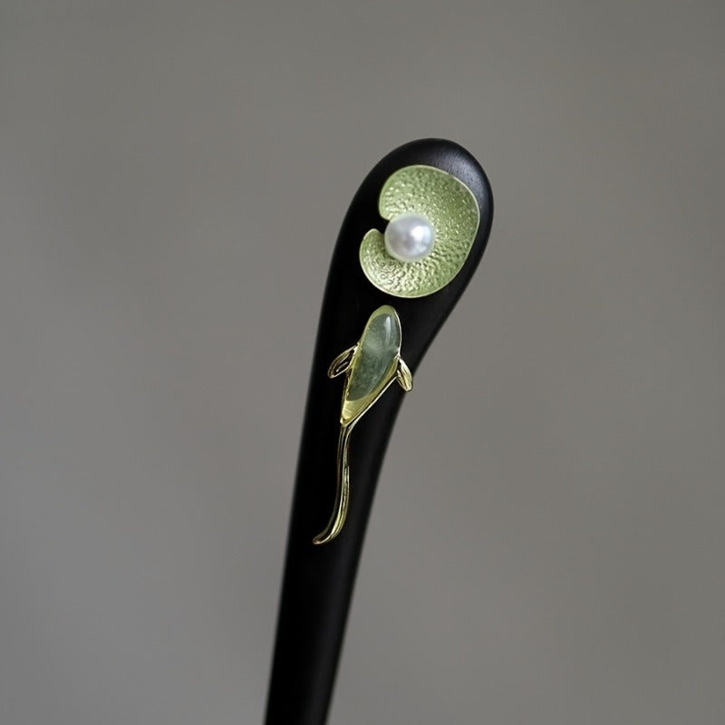 This single koi hairpin shaped like a lotus leaf combines natural energy flow with elegant craftsmanship for a unique accessory perfect for everyday use or special occasions. The combination of black wood and green-gold accents creates an elegant look that supports mindful adornment.
