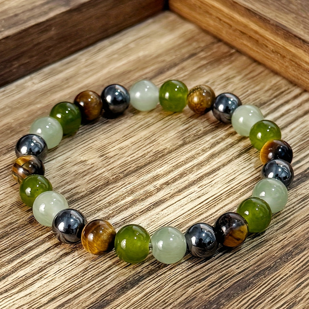 The Tiger Eye represents prosperity and confidence, while Olive Green symbolizes growth and harmony. Black Hematite provides protection and grounding energy.