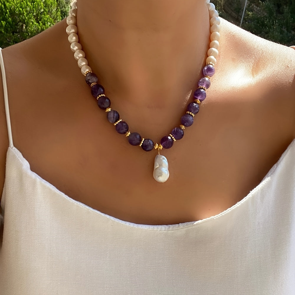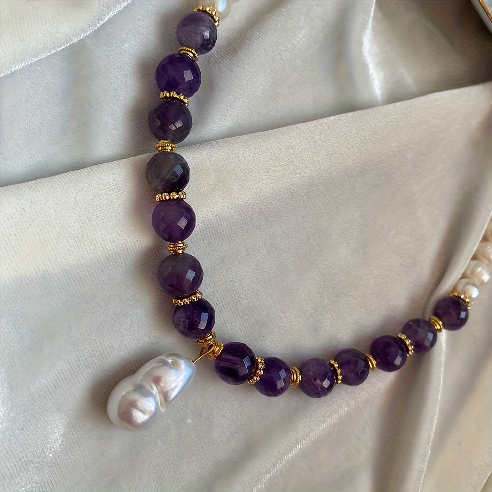 This Elegant Amethyst Baroque Pendant Necklace combines the tranquil beauty of purple amethyst beads with the timeless elegance of baroque pearls. The deep purple stones promote calmness, energy balance, and spiritual clarity, while the pearls add purity and sophistication to the design. The gold accents enhance luxury and opulence, symbolizing wealth and prosperity.