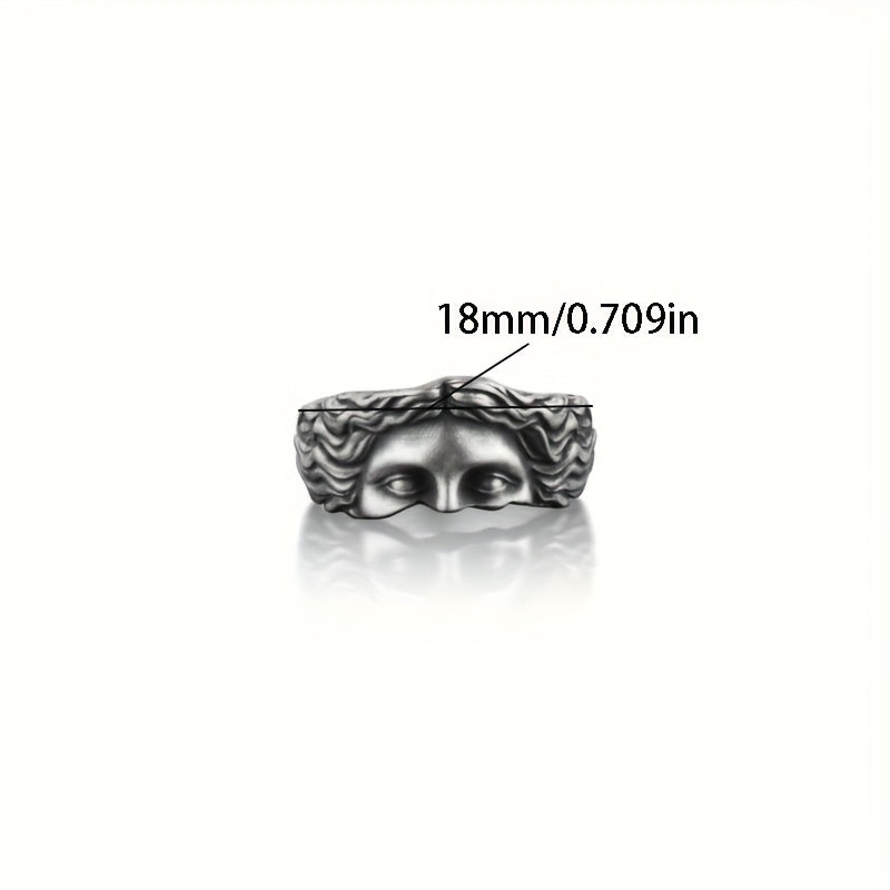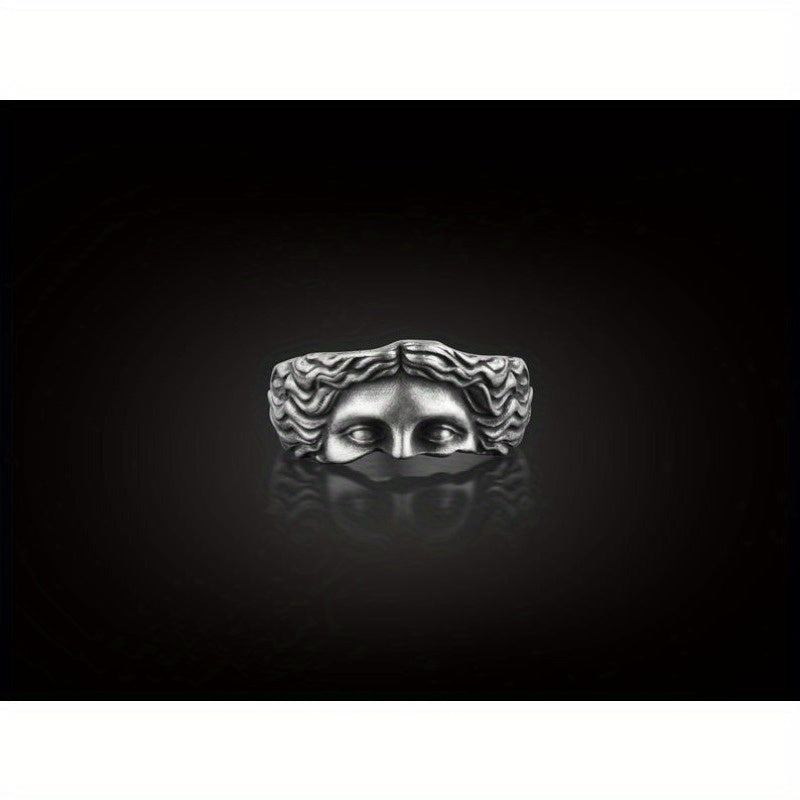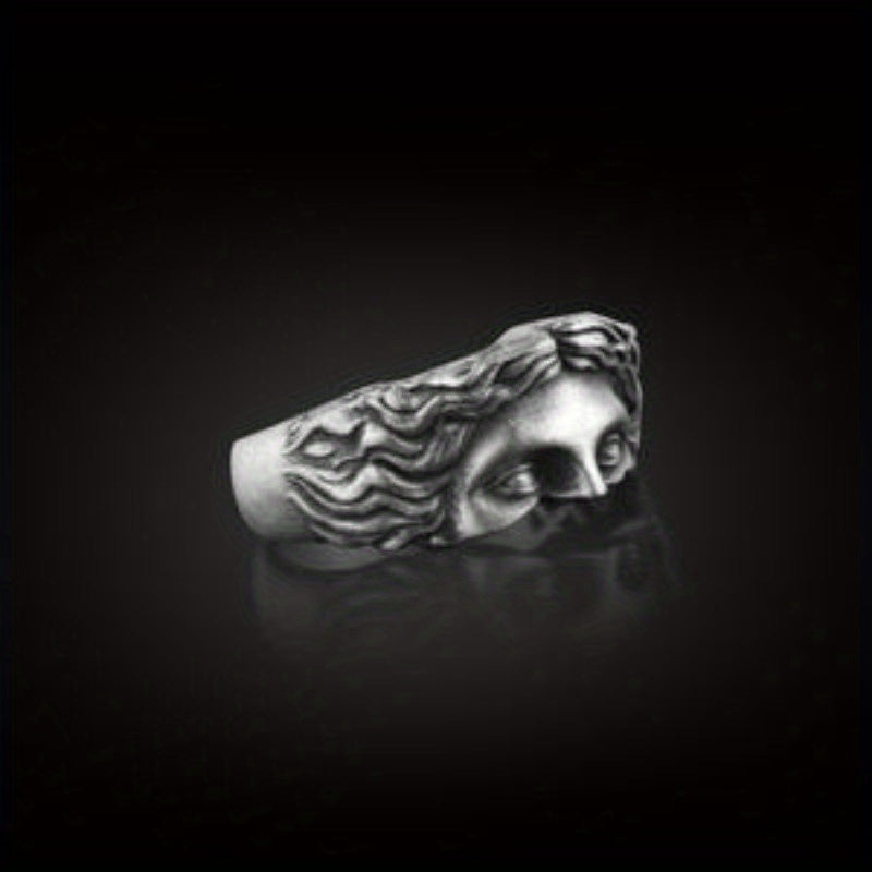 This spiritual ring is crafted from high-quality stainless steel or sterling silver, plated with a matte antique finish to give it an authentic ancient Greek aesthetic. The surface is textured to resemble weathered stone, enhancing its mystical appearance. The design features a detailed sculpture of wavy hair and serene eyes, reminiscent of classical Greek art, symbolizing the goddess Venus (Aphrodite).
