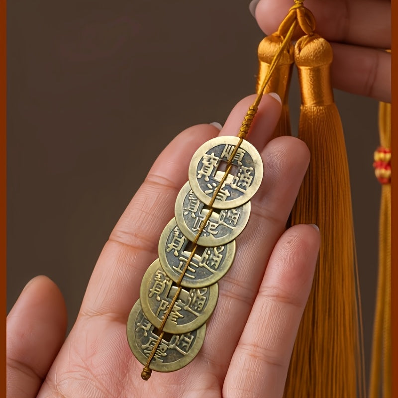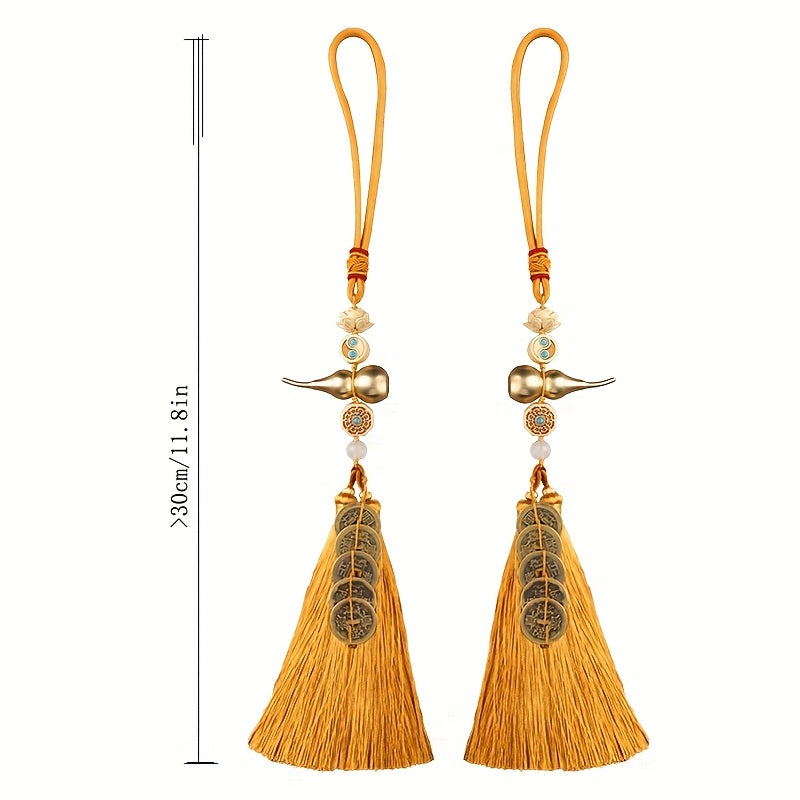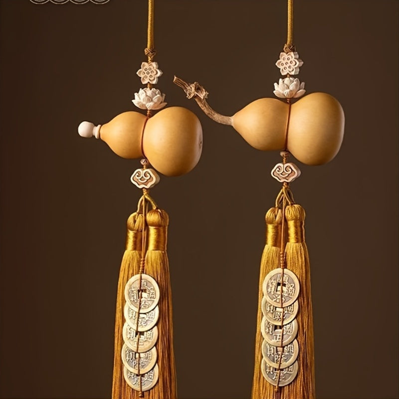 This set includes 2 handcrafted tassel charms combining the classic Five-Emperor copper coins with a brass gourd (Hulu), a carved boxwood lotus, turquoise-tone patterned beads, and a silky golden tassel. In Feng-Shui, the Five-Emperor coins (Shunzhi, Kangxi, Yongzheng, Qianlong, Jiaqing) symbolize continuous prosperity, lineage support, and protection. Hang them at a door, in the car, or in your wealth sector to invite steady opportunities, clear obstacles, and harmonize mind–body energy.