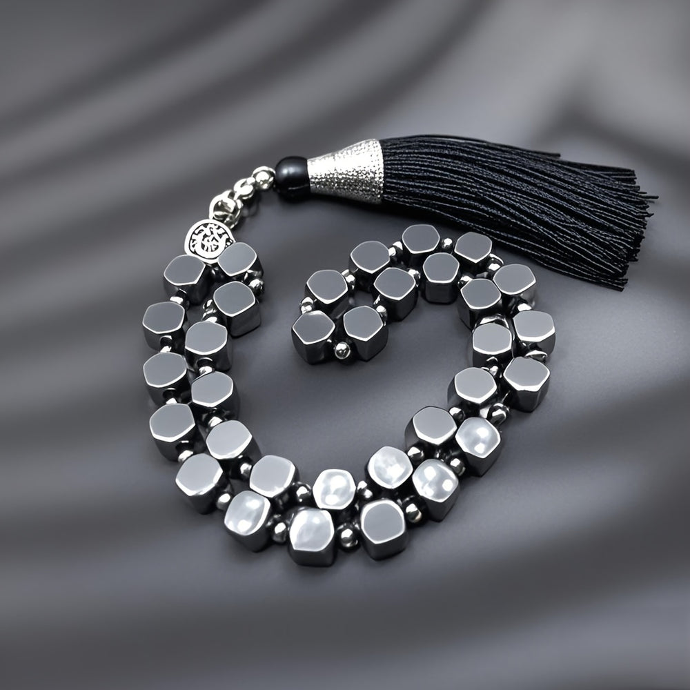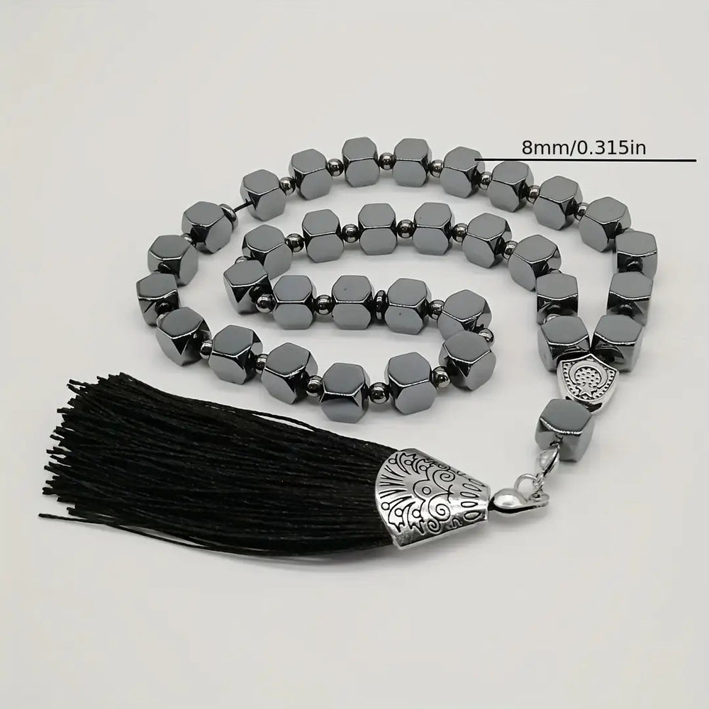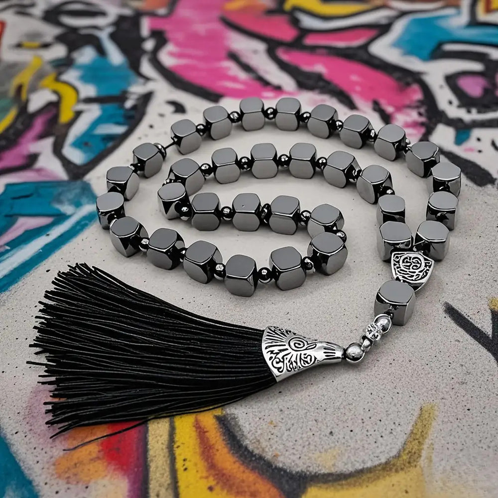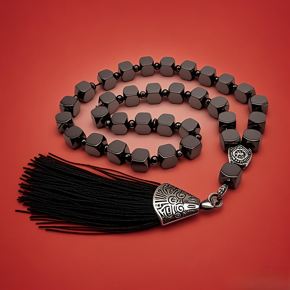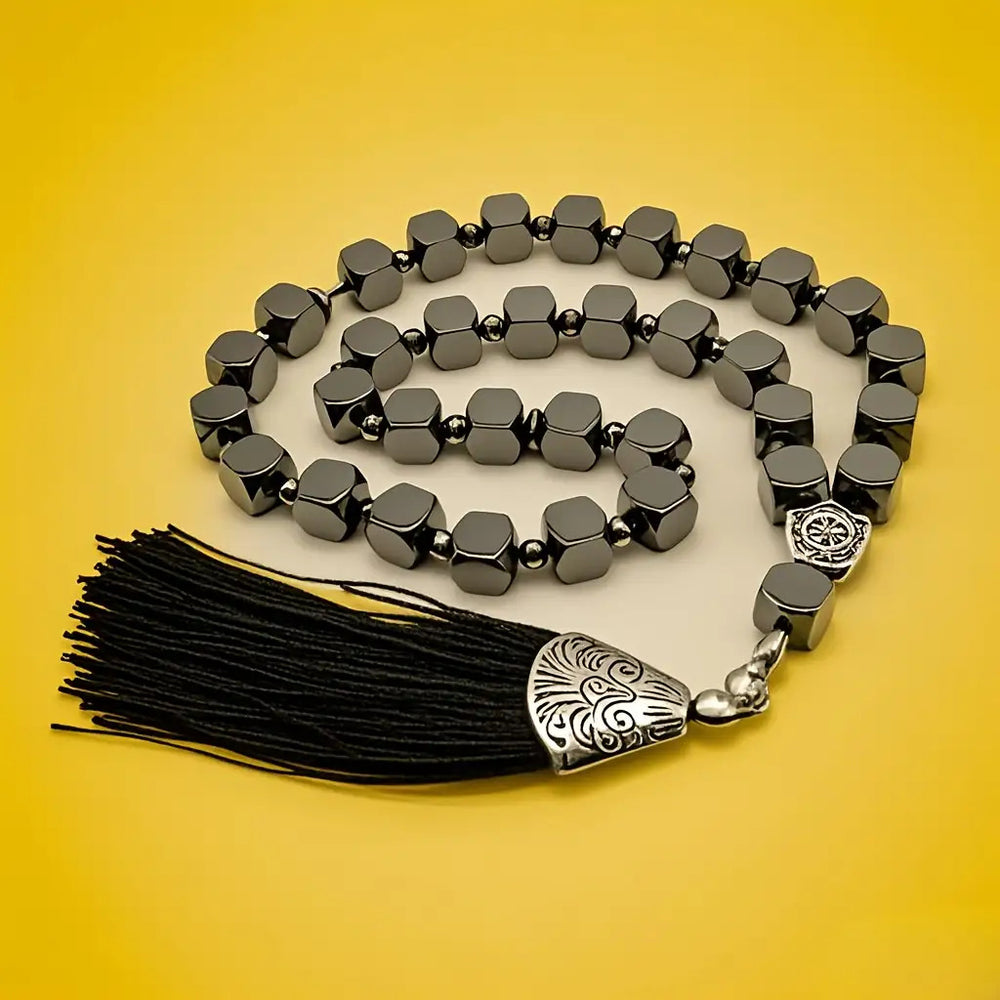 Black onyx has been revered since ancient times for its protective and grounding properties. In Islamic tradition, prayer beads (Misbaha or Tasbih) serve as a tangible connection to faith, helping believers focus during remembrance of Allah. The 33-bead count represents the 99 names of Allah when counted three times, making this a spiritually significant tool for devotion. The hexagonal bead shape symbolizes balance and harmony in creation, while the black color represents protection and the absorption of negative energies. The silver tassel adds an element of purity and divine connection, completing this powerful spiritual tool.