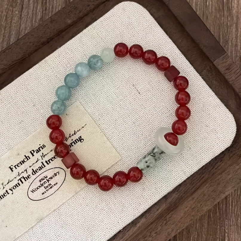Crafted with smooth agate beads in red, blue-green, and yellow hues, this bracelet features an elastic stretch cord for comfortable wear. The natural stones symbolize stability and protection, while the vibrant colors enhance creative energy.