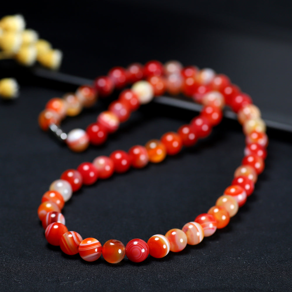 The necklace showcases agate's natural banding in earthy tones of brown, cream, and terracotta, creating a visual rhythm that echoes nature's patterns. Each bead is uniquely patterned, ensuring your necklace is as individual as you are, while the central pendant serves as a focal point for meditation and energy work.
