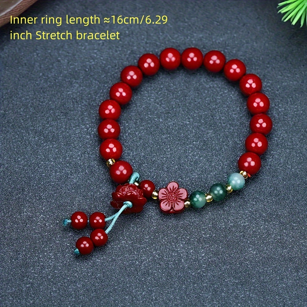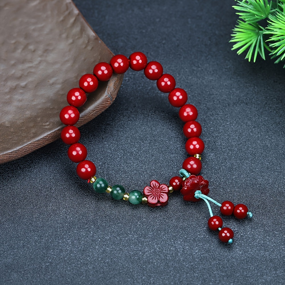 This Bohemian Style Cinnabar Bracelet features vibrant red and calming green beads with golden accents and carved floral designs. The red beads symbolize energy, passion, and good fortune, while the green beads represent balance, harmony, and natural connection. The golden accents enhance elegance and the carved floral designs add beauty and renewal.