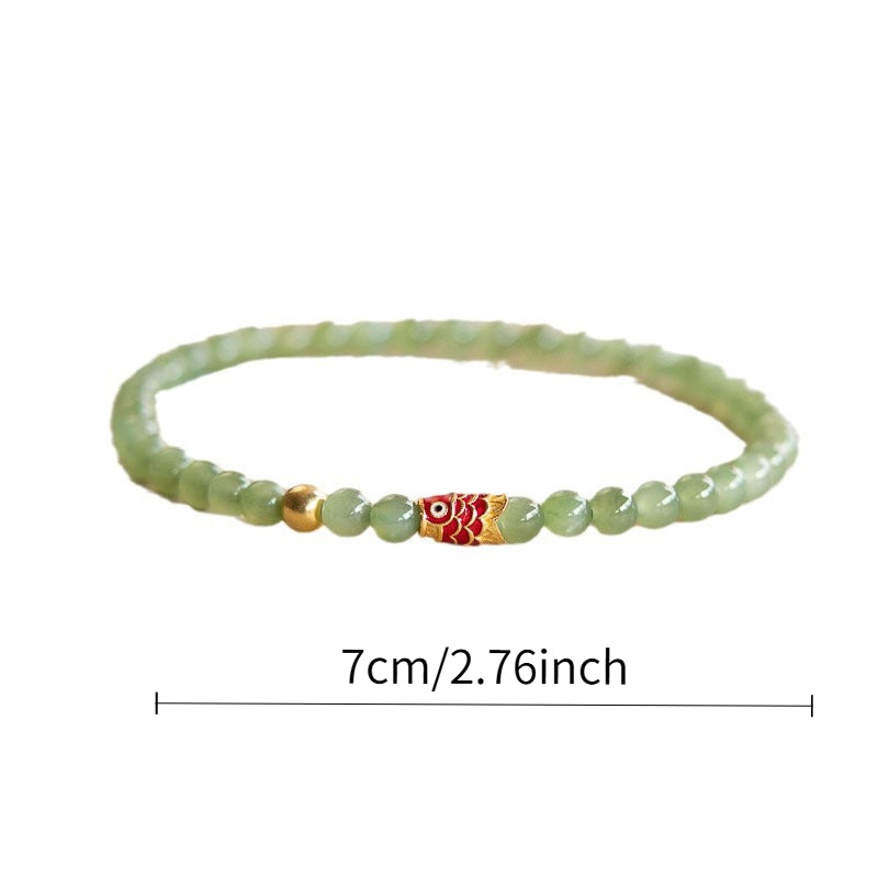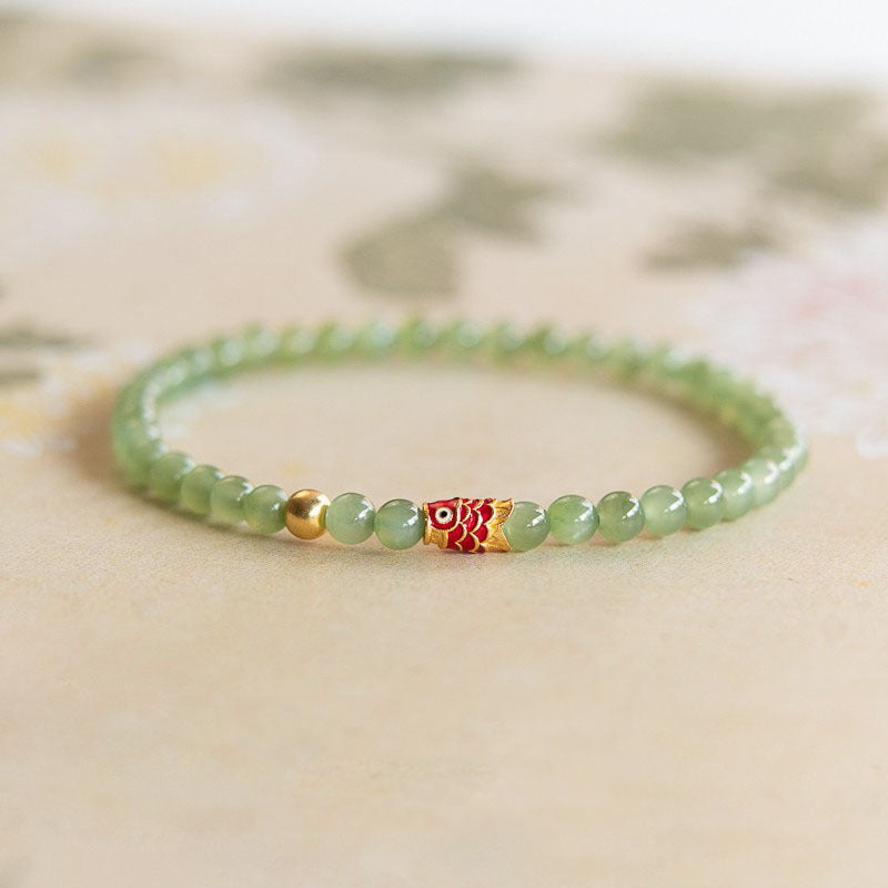 Crafted with smooth green gemstones and golden-tone beads, this bracelet features a semi-transparent quality that enhances its natural, earthy look. The koi fish charm, crafted in red and gold, adds a striking contrast and symbolic meaning to the design.