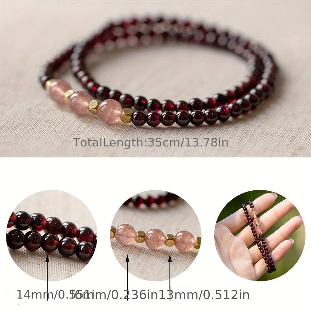 This bohemian multi-layer bracelet features wine red beads, pink crystals, and gold accents in a layered design. The 35cm length and alternating pattern create visual depth and symbolic significance perfect for everyday elegance or special occasions.