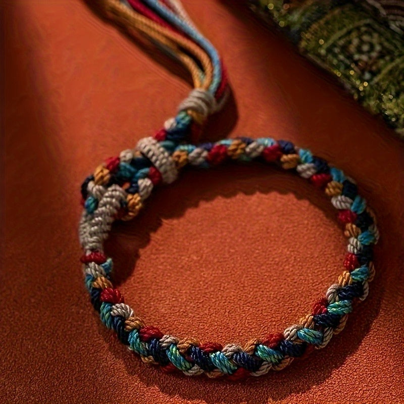 This handcrafted Bohemian tribal rope bracelet features a vibrant multi-colored braided design with an adjustable knot. Each bracelet is made from high-quality synthetic fibers, creating a lightweight and comfortable accessory that can be worn daily. The intricate braiding pattern represents the interconnectedness of life, while the adjustable design ensures a perfect fit. Wear it as a protective talisman to attract positive energy, enhance harmony, and bring good luck to your journey.