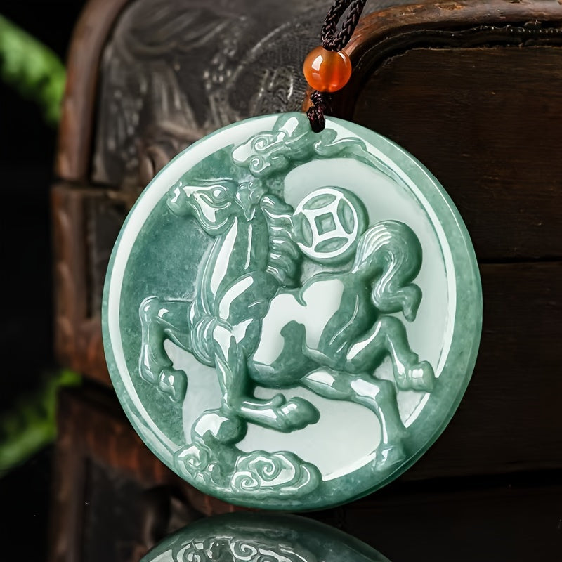 The Bohemian Zodiac Horse Pendant embodies prosperity energy and light green natural stone elegance. The circular design features a horse and ancient coin motif with cloud patterns, symbolizing success, wealth, and good fortune. This handcrafted necklace combines traditional symbolism with modern bohemian fashion, perfect for daily wear and special occasions.