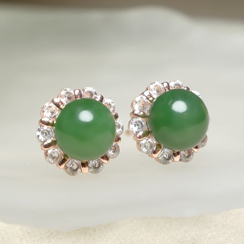 “The natural green stone and rose gold hoops create a powerful harmony talisman that supports mindful living and positive energy flow.”