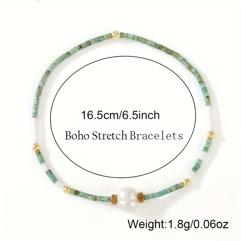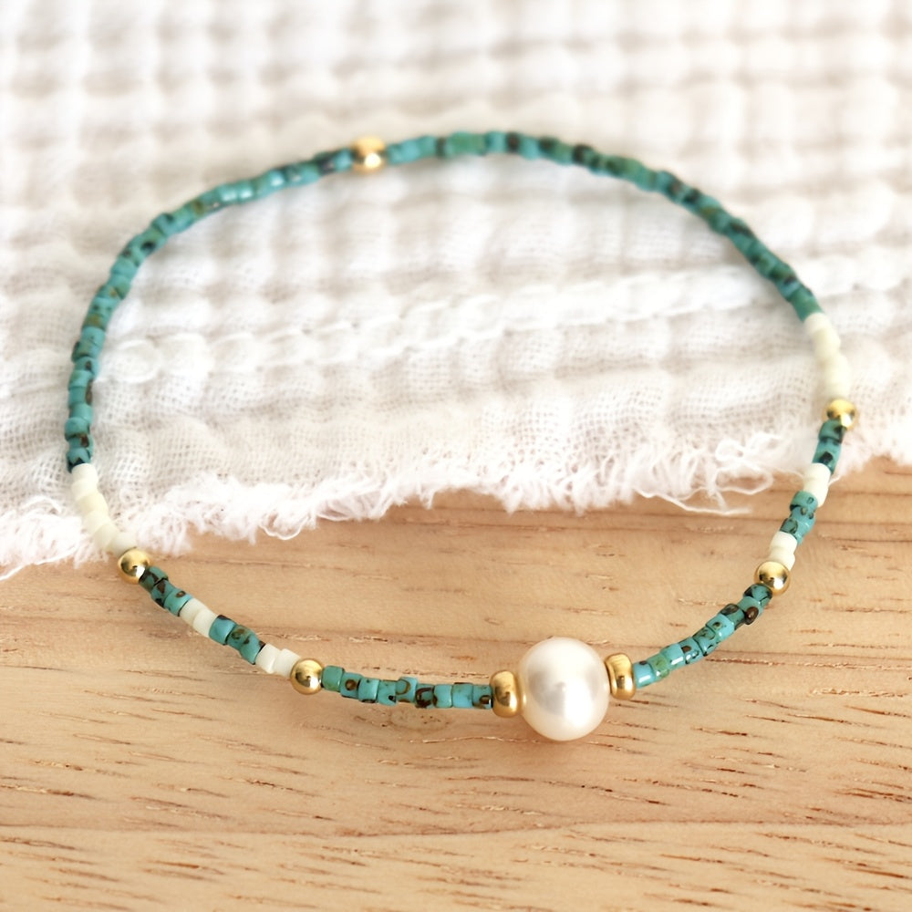 This bohemian tiny beaded pearl charm stretch stack bracelet features delicate turquoise and white beads with gold accents and a freshwater pearl charm. Designed for the free-spirited woman, this stretch bracelet combines natural elements with boho style to create a piece that enhances intuition, emotional balance, and spiritual harmony. Perfect for stacking or wearing alone as a meaningful daily accessory.