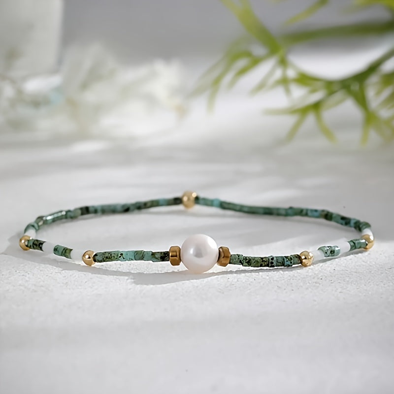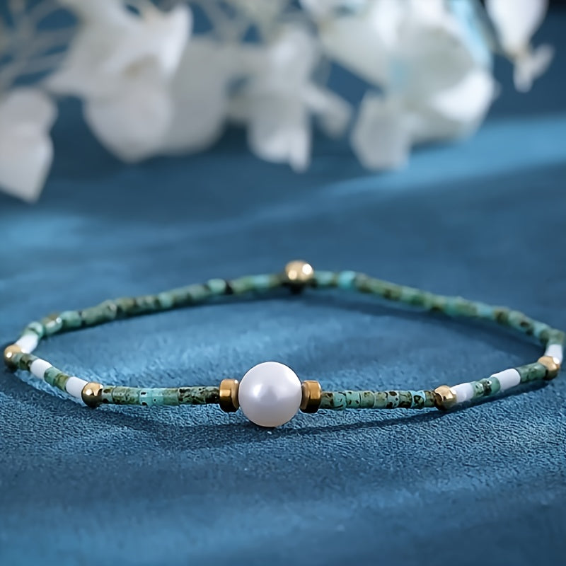 Summary: This bracelet combines the calming turquoise energy with the intuitive pearl wisdom to create a harmonious balance for emotional well-being and spiritual insight. The delicate beads and pearl charm work together to enhance intuition, promote emotional healing, and connect you to your inner truth, making it an ideal accessory for those seeking both style and spiritual harmony in their daily life.