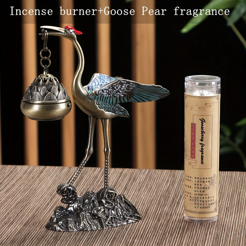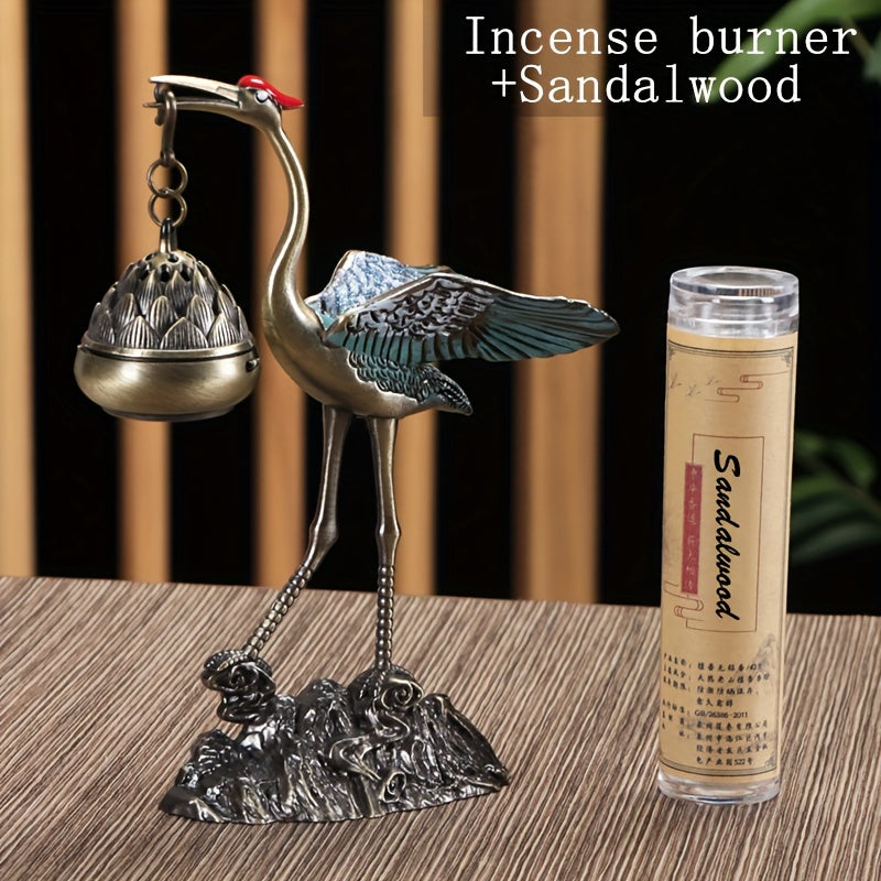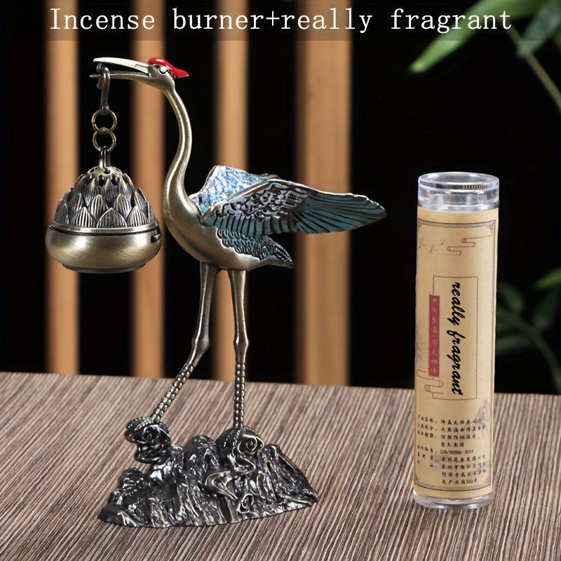 This bronze crane incense burner features an ornate crane design symbolizing health, longevity, and good luck. The swirling smoke design enhances the aromatic experience, creating a calming ambiance perfect for meditation spaces or living rooms.