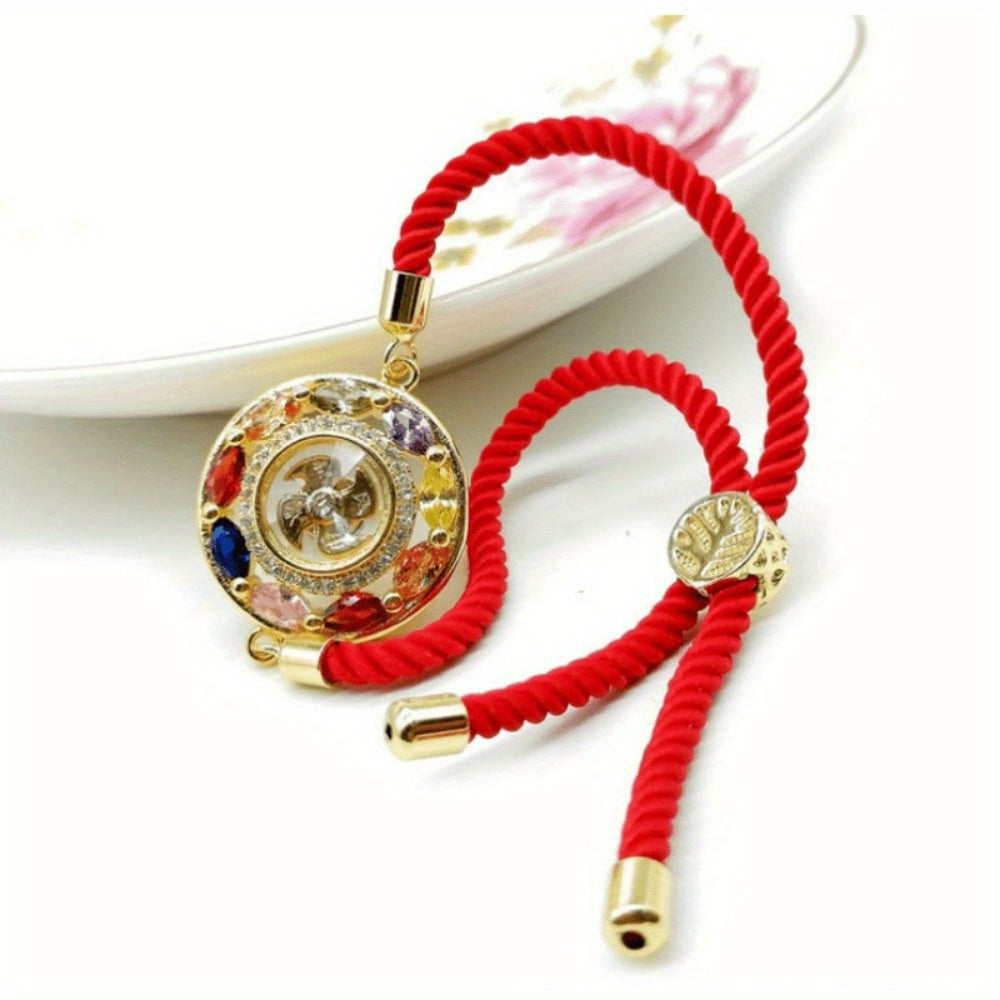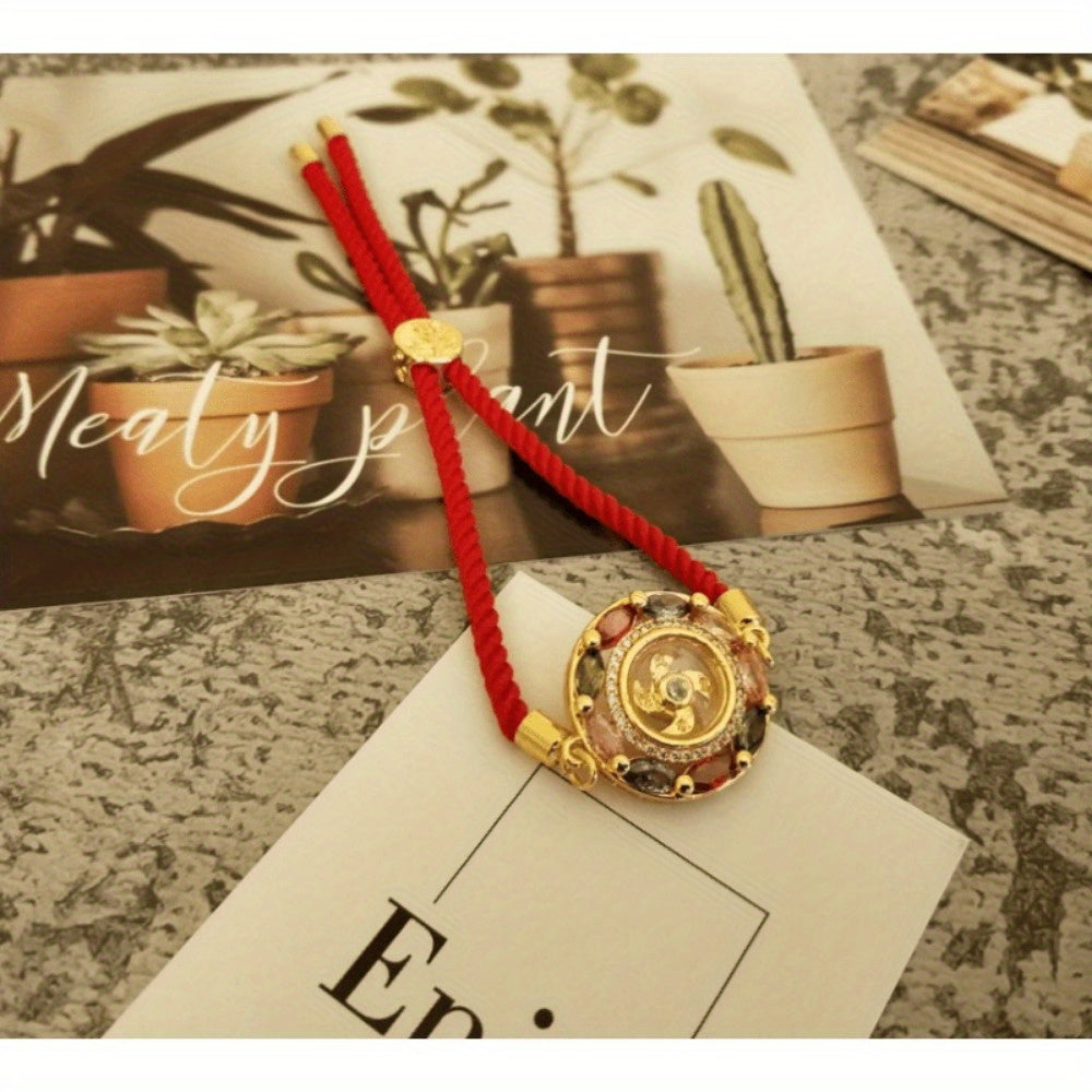 This bracelet embodies profound spiritual symbolism. The rotating Buddha wheel represents the eternal Dharma and the path to enlightenment. The multicolor gemstones create a vibrant energy field, with each color contributing unique properties: red for vitality, orange for creativity, yellow for wisdom, green for healing, blue for peace, and purple for spiritual awareness. The red cord symbolizes protection, passion, and life force energy. Together, these elements create a powerful talisman for attracting positive energy while promoting spiritual harmony and protection.