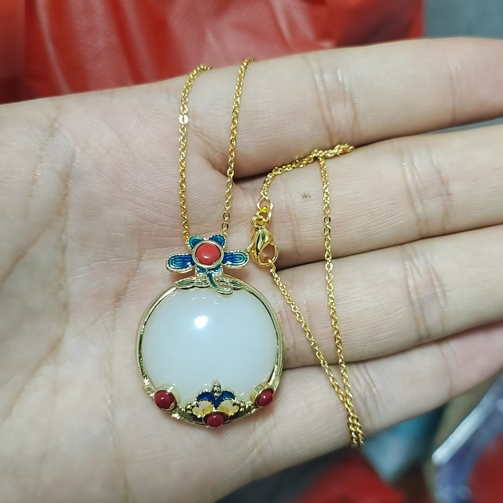This exquisite Burnt Blue Lotus Jade Pendant is a masterpiece of spiritual artistry and elegant design. The necklace features a luminous, milky white jade disc, hand-carved and adorned with a delicate lotus flower in a striking burnt blue enamel. This piece is more than just jewelry; it is a powerful talisman for spiritual growth, inner peace, and emotional balance. The combination of the sacred lotus symbol with the serene energy of jade creates a unique accessory that supports your journey toward enlightenment and tranquility.