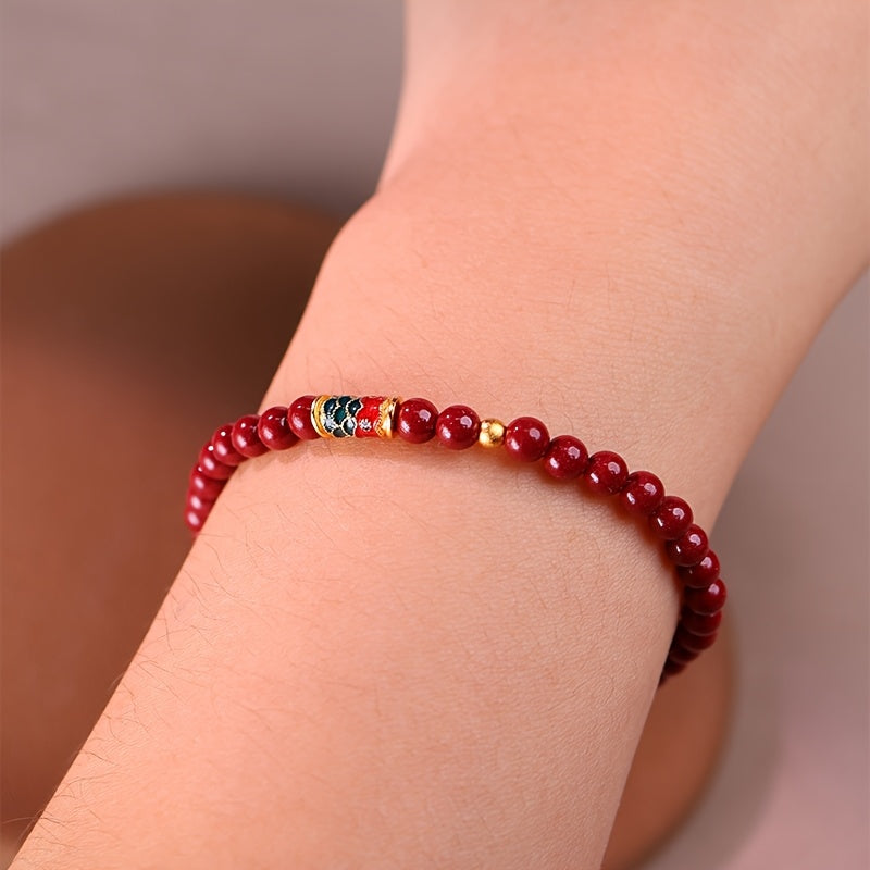Crafted with smooth cinnabar beads and an elastic cord, this bracelet features a decorative center bead with intricate koi patterns. The cinnabar beads symbolize protection and good fortune, while the elastic cord ensures comfortable wear.