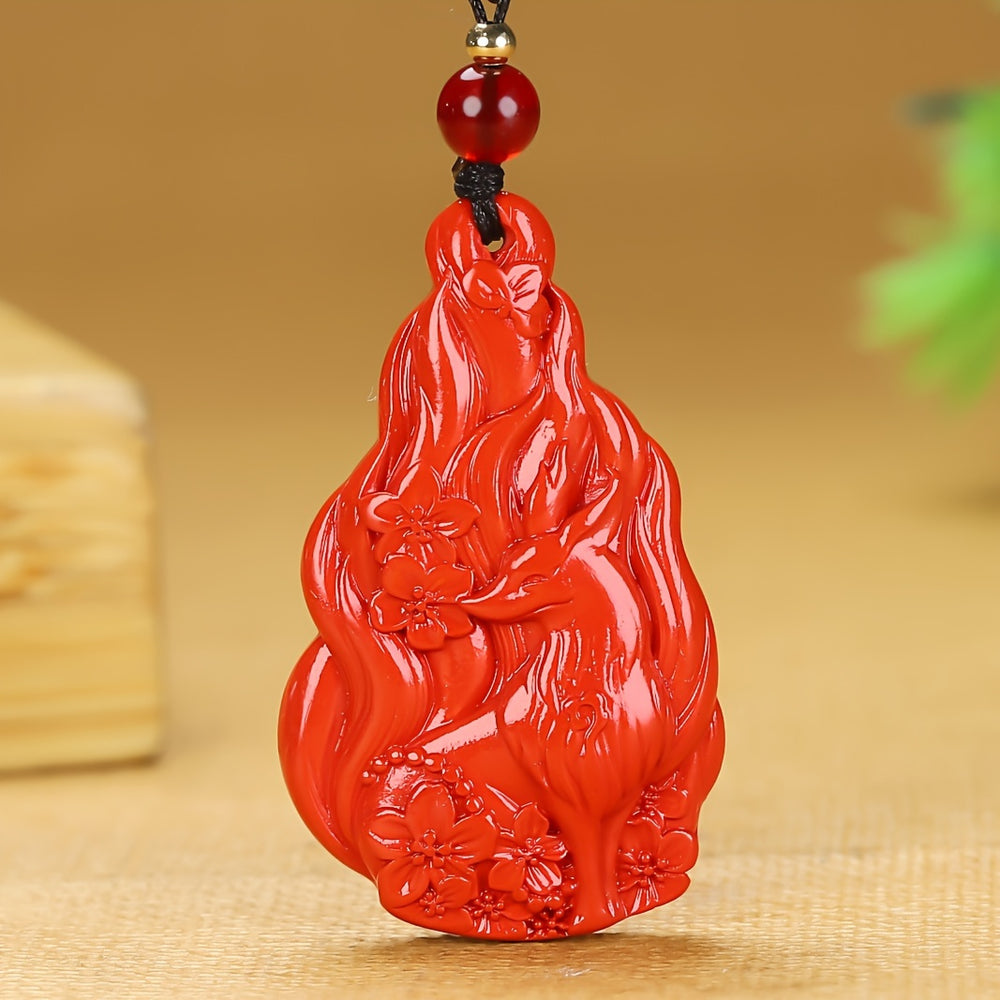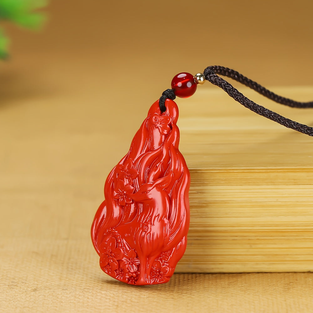 The Nine-Tailed Fox (*huli jing*) is a revered figure in Chinese folklore, often depicted as a guardian who brings good fortune and wards off evil. Its carving on cinnabar amplifies these energies, making the pendant a talisman for protection and prosperity.