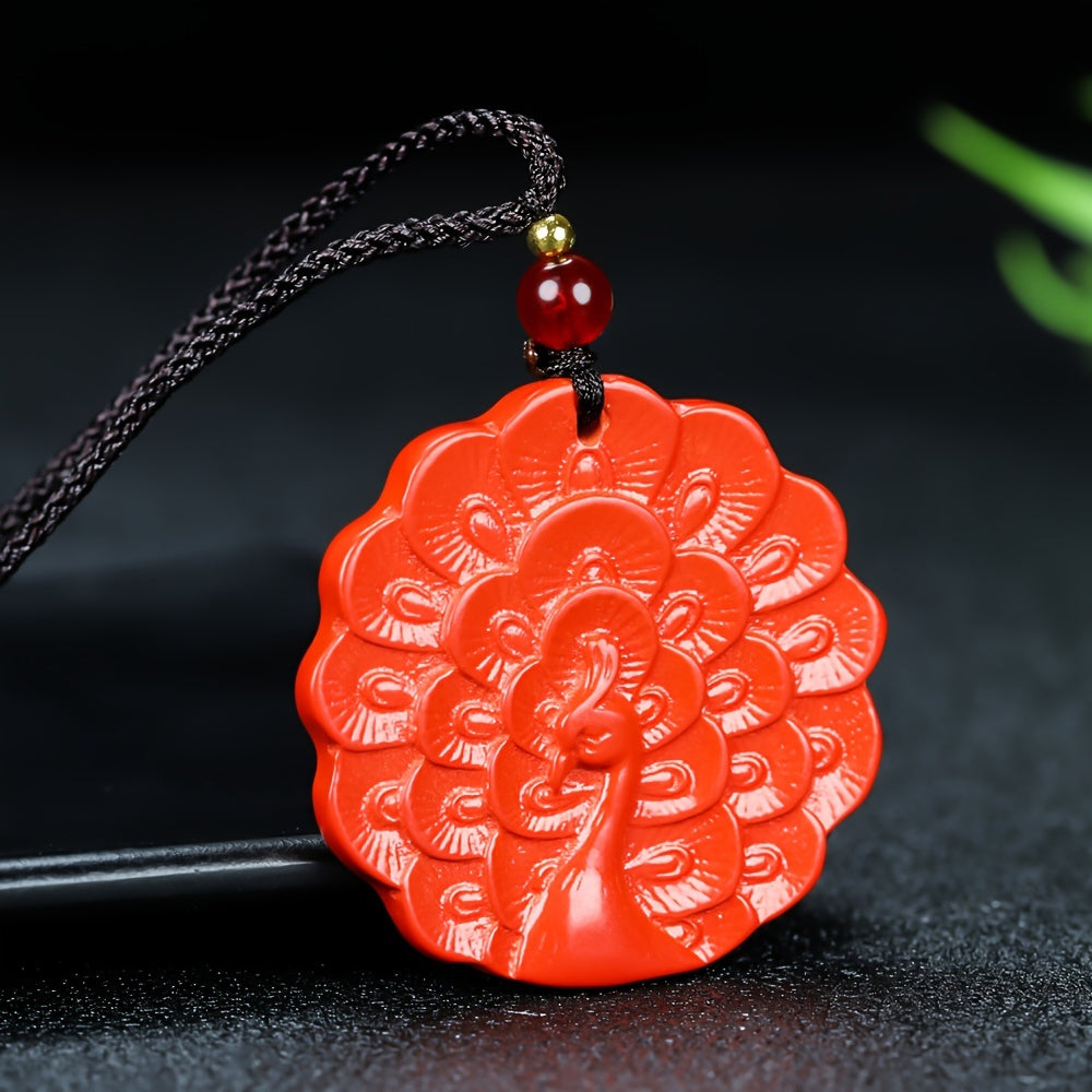 This Elegant Cinnabar Peacock Pendant Necklace is a masterful blend of ancient symbolism and modern style. The pendant, exquisitely carved from vibrant red cinnabar, showcases the majestic peacock, a powerful emblem of prosperity, beauty, and spiritual awakening. Designed as a unisex fashion accessory, its bold presence makes it an ideal choice for men seeking to enhance their personal power and for anyone wishing to attract luck and positive energy into their life.