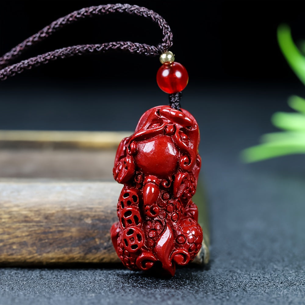 This cinnabar pendant necklace features authentic cinnabar craftsmanship with traditional Pixiu symbolism. The vibrant red color represents vitality and good fortune, while the Pixiu creature wards off negative energies and attracts wealth.
