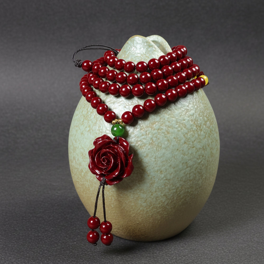Cinnabar, known historically as "the stone of immortality" in Chinese culture, carries profound protective energy that shields the wearer from negative influences. The Rose, an eternal symbol of love and beauty, transforms this protective quality into a force that nurtures relationships and fosters emotional intimacy.