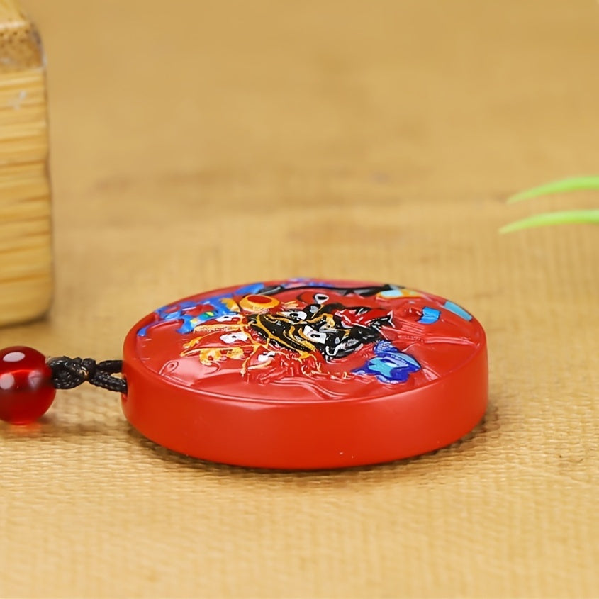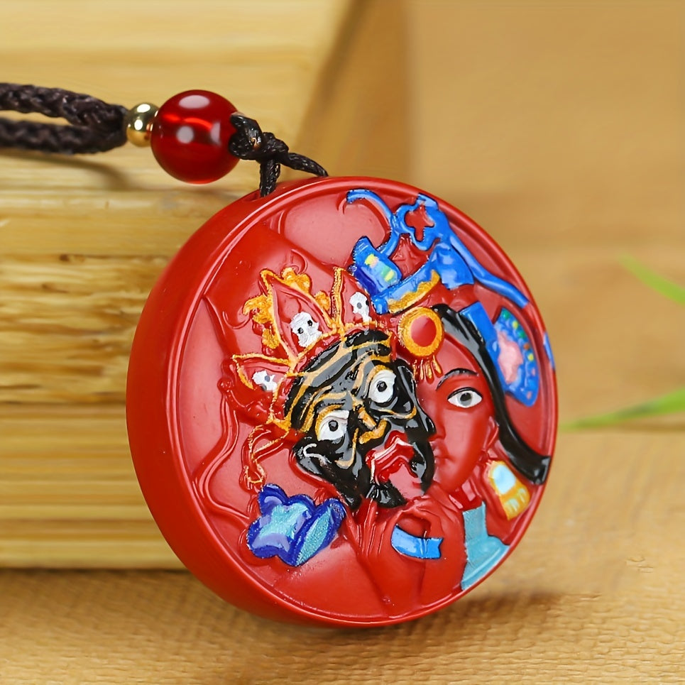 The pendant's striking red hue captures the essence of life force and vitality. Its double-sided nature presents a unique visual and energetic experience, showcasing both a powerful protective deity and a serene, compassionate figure. Suspended from a durable, adjustable dark cord, this necklace combines ancient symbolism with potent energy, creating a unique and meaningful piece of wearable art.
