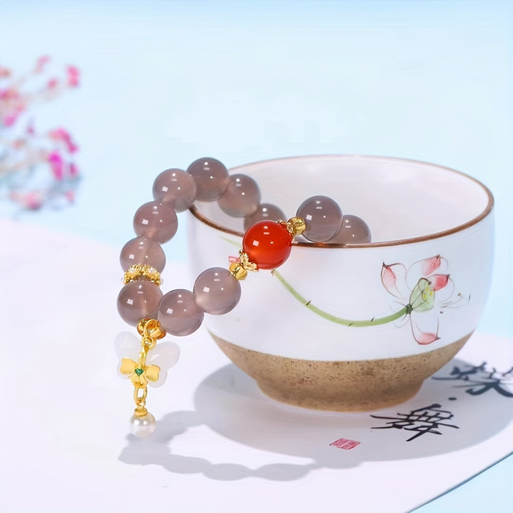 This Elegant Agate Crystal Bracelet features gray agate beads with a red jade charm, combining vintage Chinese style with meaningful energy symbolism. The gray beads symbolize stability and calmness, while the red jade charm enhances vitality and positive energy. The round beads represent completeness and infinite energy flow.