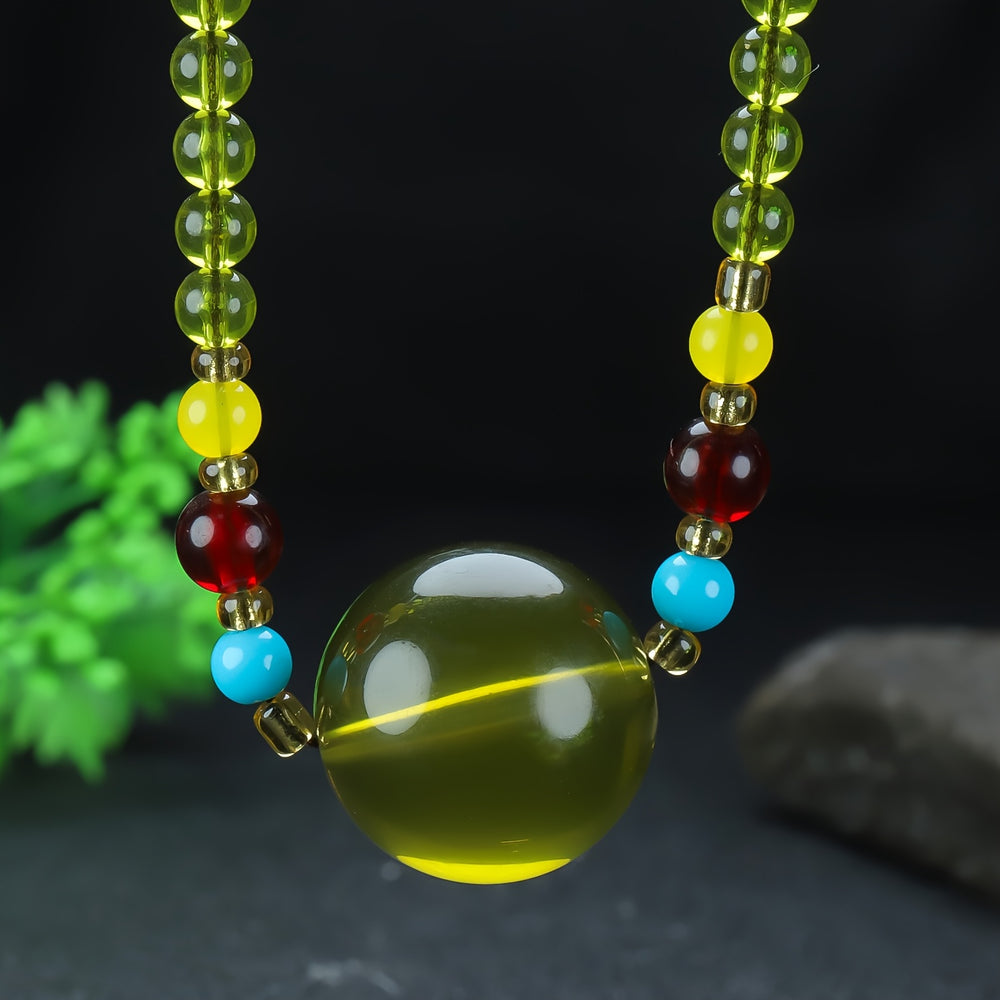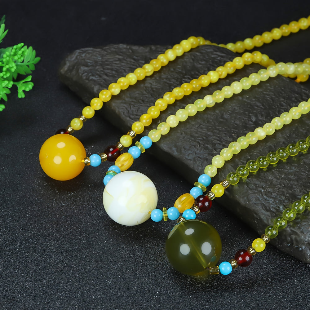 Embrace casual elegance and joyful energy with our Elegant Amber Beaded Necklace. This piece features a string of warm, natural amber beads leading to a large, polished amber pendant, accented by vibrant blue, red, and yellow beads and a colorful peace symbol. Designed for everyday wear, it blends bohemian charm with subtle spiritual meaning, making it a versatile addition to any jewelry collection.