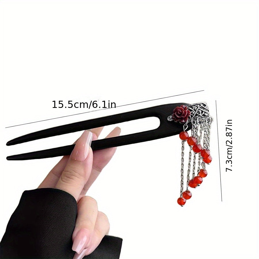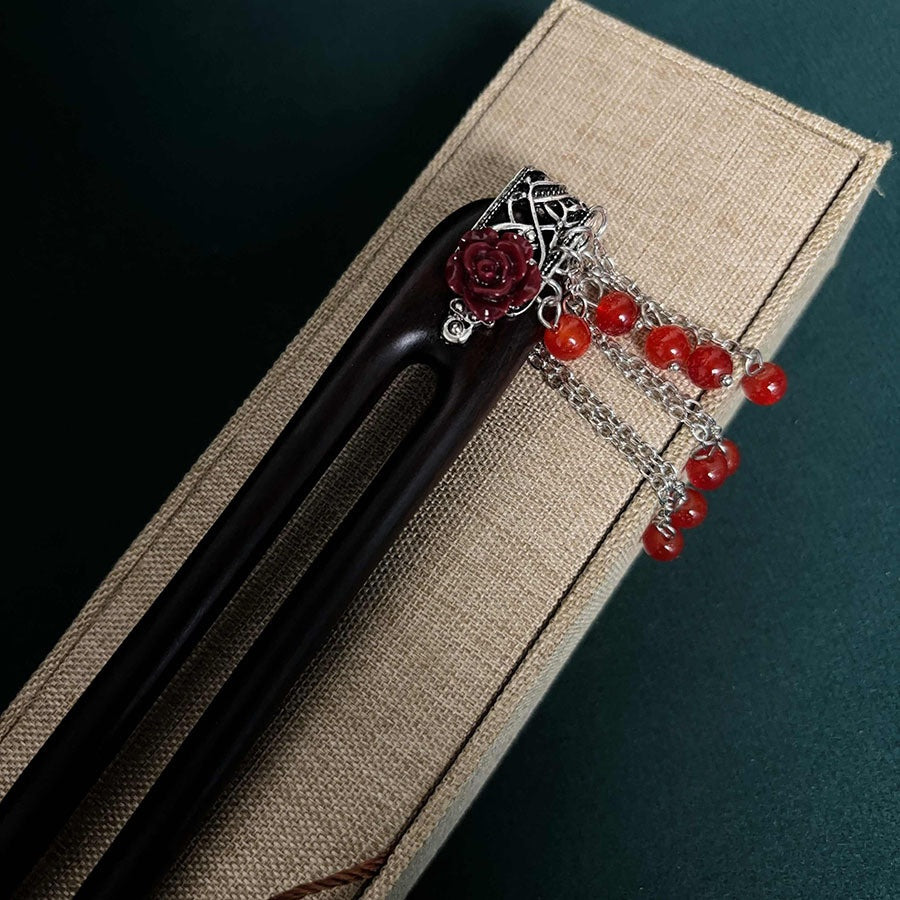 Crafted from smooth black resin with intricate red rose and silver chain accents, this hairpin features a combination of materials including metallic elements for the floral details and glossy beads for the tassels. The non-slip grip ensures secure hold while the decorative elements add a touch of elegance and cultural depth.