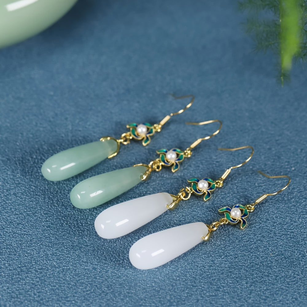 This natural stone earrings feature elegant teardrop-shaped stones in soft green hues with delicate blue-green floral motifs. The combination of antique gold accents and Hanfu-inspired design creates a timeless accessory perfect for mature women seeking both elegance and spiritual harmony.