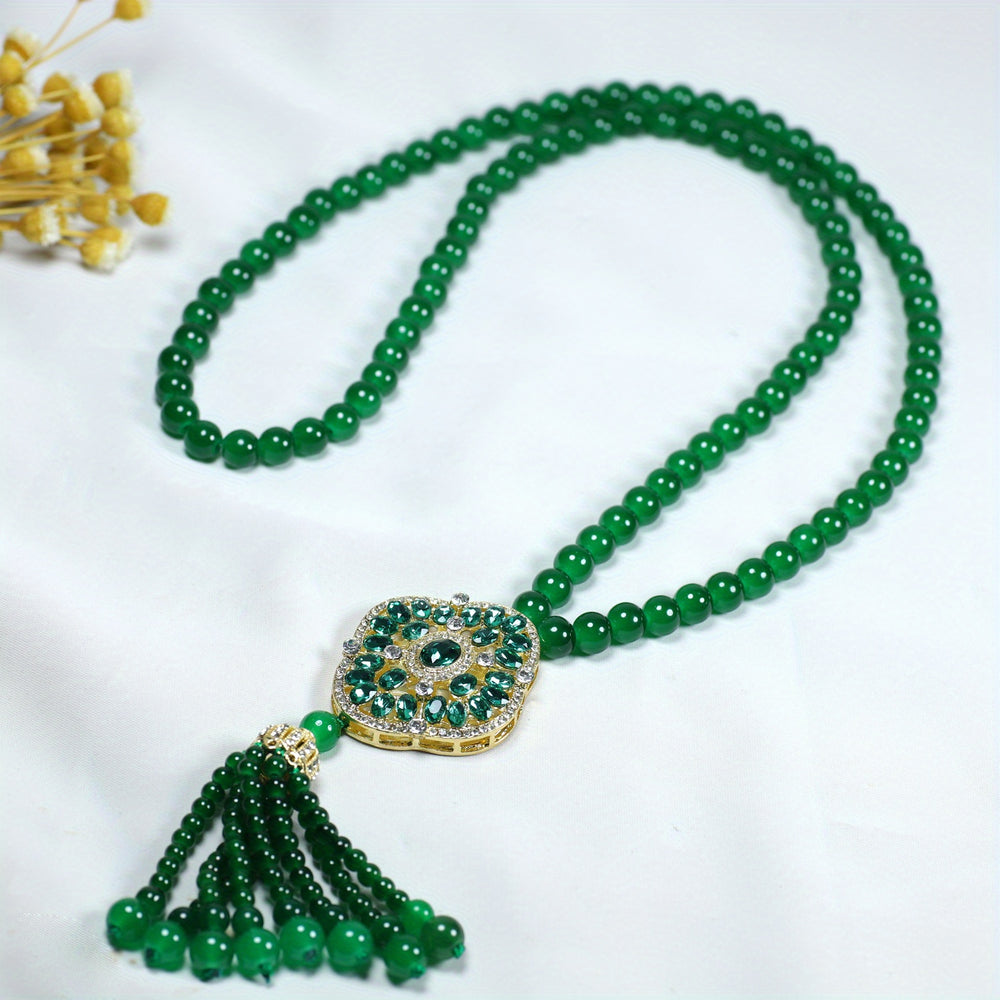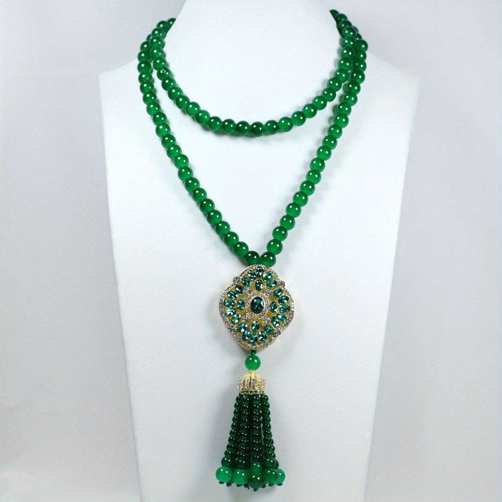 Step into a realm of vintage-inspired luxury with our Elegant Faux Jade Flower Pendant Necklace. This captivating piece masterfully blends the serene beauty of jade with the opulent warmth of golden-tone accents, culminating in a stunning floral pendant adorned with a graceful tassel detail. Designed to evoke the glamour of a bygone era, this necklace is the quintessential accessory for transforming any outfit into a statement of sophisticated elegance for weddings, galas, parties, and momentous celebrations.