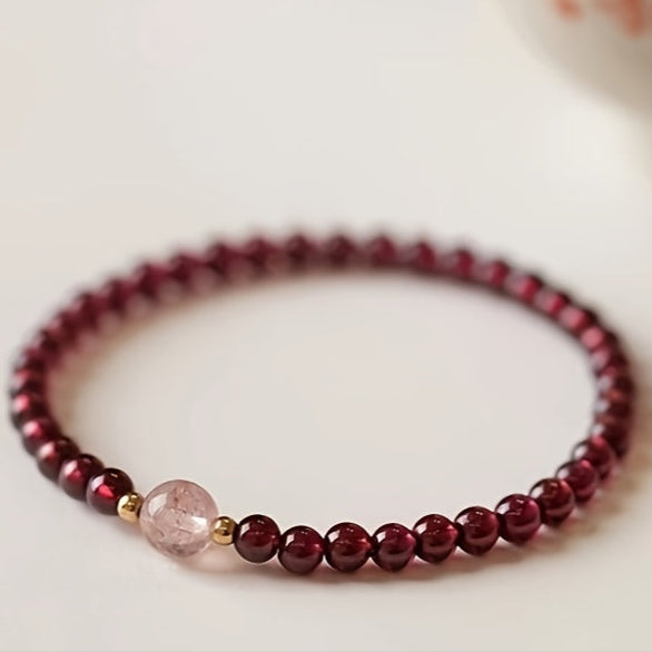 Crafted from smooth natural garnet beads with a pink accent bead, this bracelet combines durable materials with elegant design. The garnet beads provide grounding energy and emotional healing properties, while the pink bead symbolizes compassion and harmony.