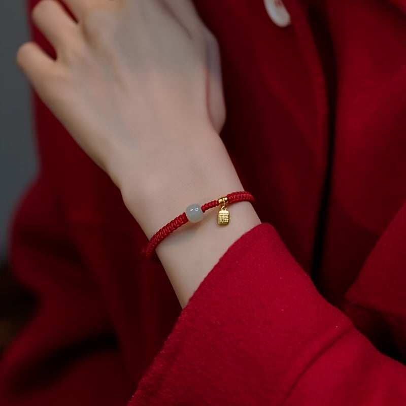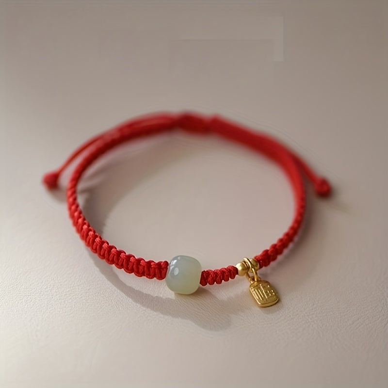 This elegant good luck charm bracelet features black braided rope with gold accents and light green cylindrical beads. The combination creates an elegant look perfect for daily wear, parties, or meaningful gifting occasions.