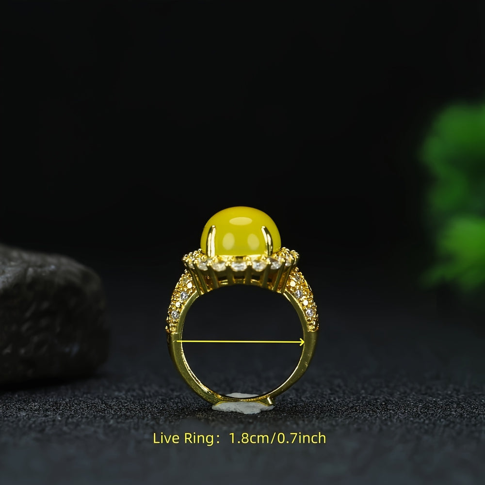 The ring's design is a masterful blend of natural beauty and classic aesthetics. The Yellow Agate, with its warm, sunny hue, acts as a focal point of positivity and power. The vintage gold-toned setting and the surrounding halo of cubic zirconia add layers of luxury and brilliance, making this more than just a ring—it's a piece of wearable art. It serves as a powerful tool for boosting confidence and attracting abundance, making it an ideal accessory for both personal empowerment and making a lasting impression.