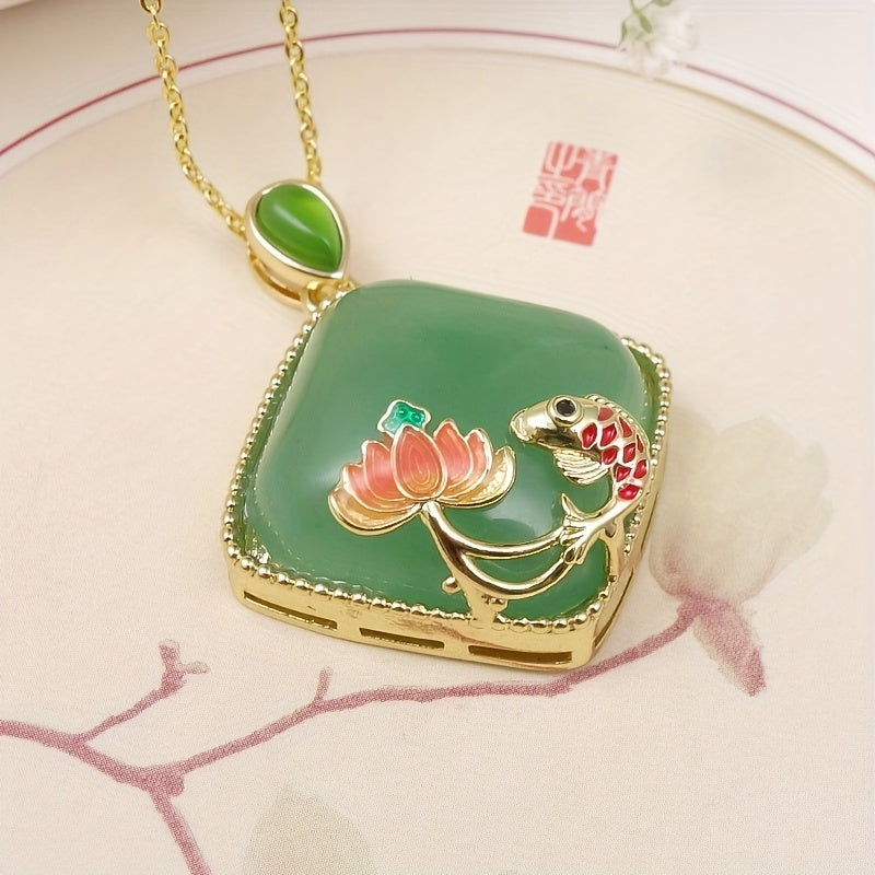 The fish and lotus symbolism represents abundance, purity, and spiritual growth in traditional culture, making this pendant ideal for those seeking harmony and positive energy in their lives.