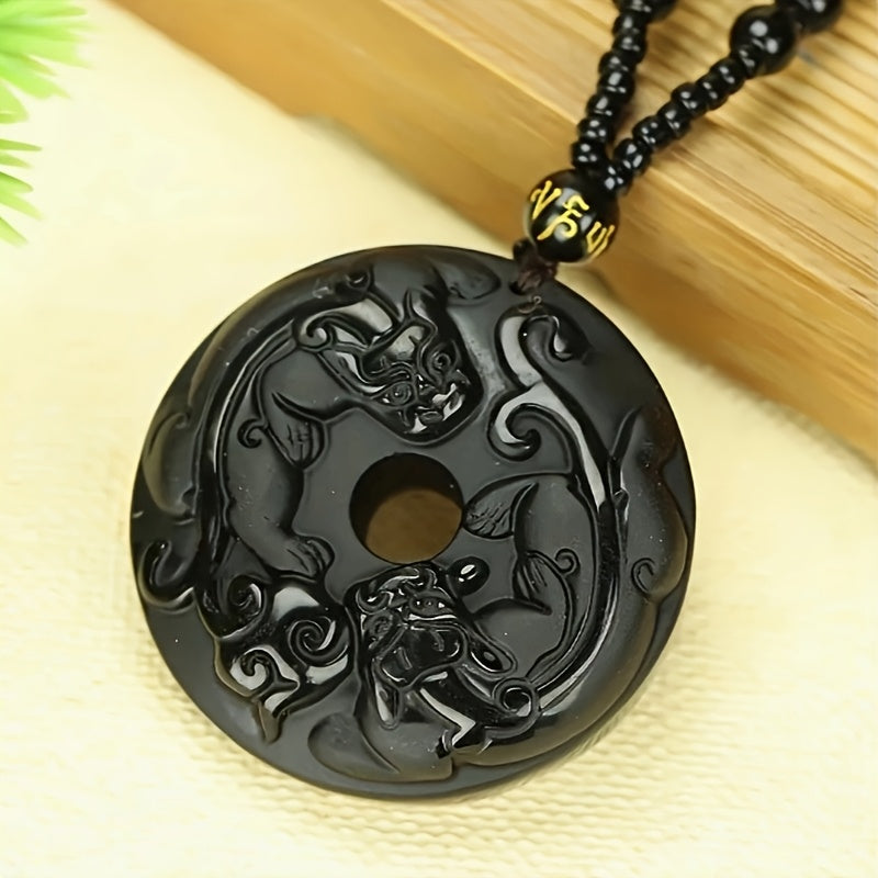 This obsidian double Pixiu pendant features intricate dragon carvings on a circular black stone. The combination of authentic obsidian and ethnic style design creates a powerful protection amulet perfect for daily wear or special occasions.