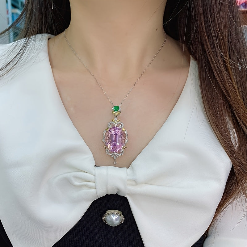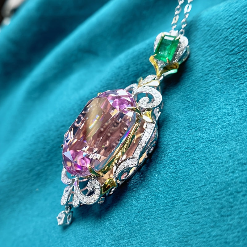 This pendant embodies profound spiritual symbolism. The pink zirconia represents love, compassion, and emotional healing. The green accent stones align with the heart chakra, promoting emotional balance and inner peace. The diamond halo amplifies the energy of the main stone, while the white gold plating enhances the pendant's spiritual vibration. Together, these elements create a powerful talisman for attracting positive energy, promoting spiritual harmony, and enhancing overall wellbeing.