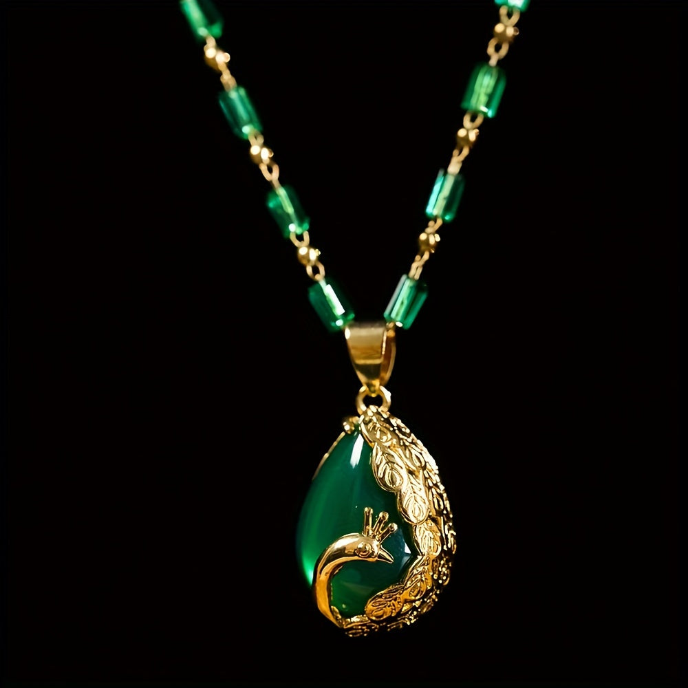 This peacock malachite pendant embodies vintage elegance with its intricate hand-carved and vibrant green malachite centerpiece. The 49+4cm adjustable chain features imitation jade beads and gold-plated accents, creating a timeless accessory suitable for all-season jewelry wear across occasions like Thanksgiving, Christmas, and Valentine's Day.