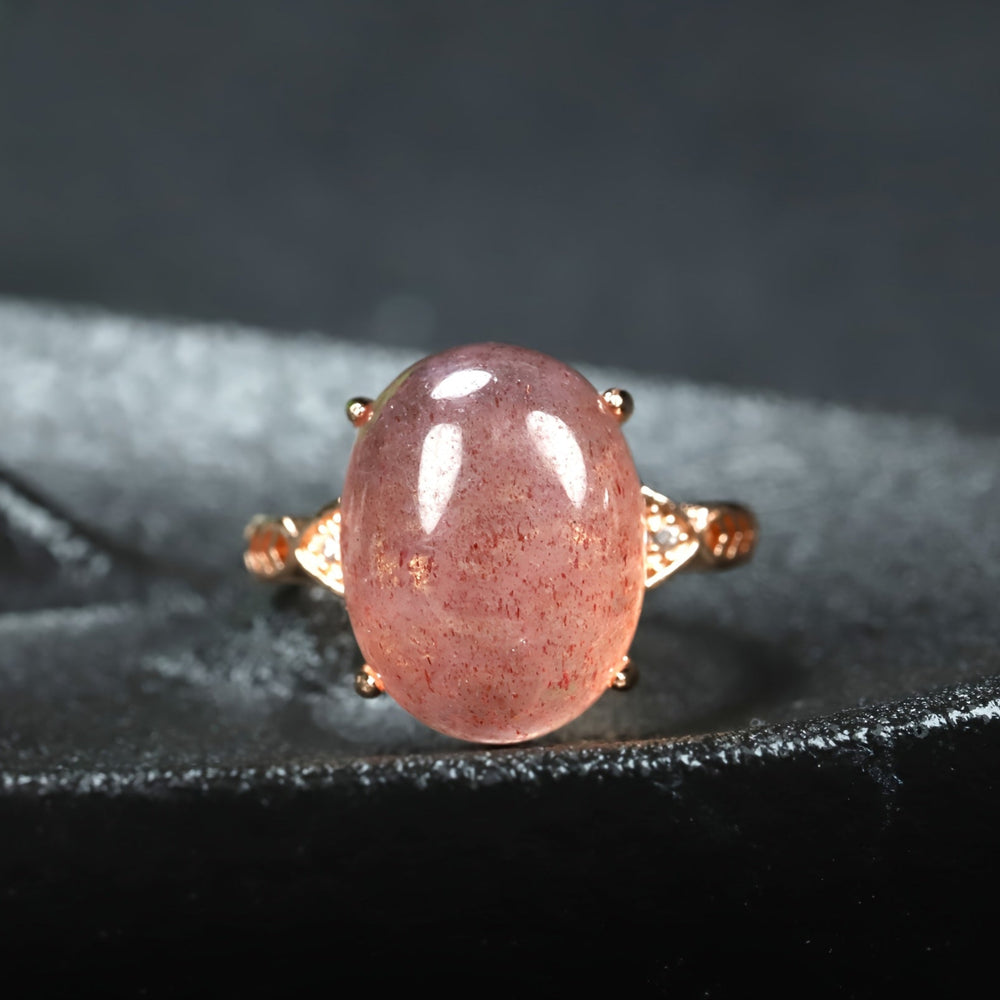 This pink strawberry quartz ring features a single stone design with an open adjustable band, perfect for Valentine's Day gifts or daily wear. The pink hue represents love, emotional healing, and harmony, while the gold-tone metal adds elegance and protection.