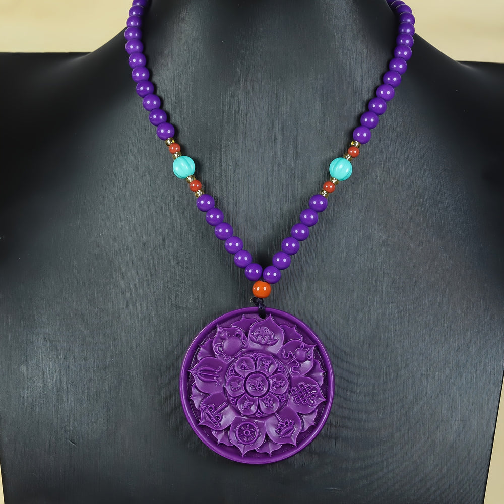 Embrace spiritual elegance with our Elegant Purple Mica Phoenix & Lotus Pendant Necklace. This exquisite unisex piece features a beautifully hand-carved pendant from natural purple mica, showcasing the powerful symbols of the phoenix and the lotus flower. Designed as a versatile sweater chain or long necklace, it's a perfect accessory for campus events, daily wear, or as a meaningful gift.